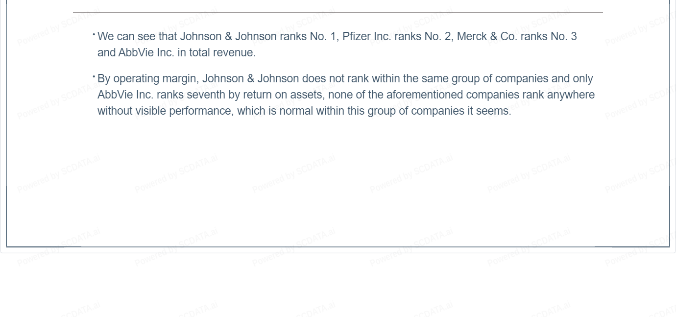 By operating margin, Johnson & Johnson does not rank within the same group of companies and only AbbVie Inc. ranks seventh by return on assets, none of the aforementioned companies rank anywhere without visible performance, which is normal within this group of companies it seems.