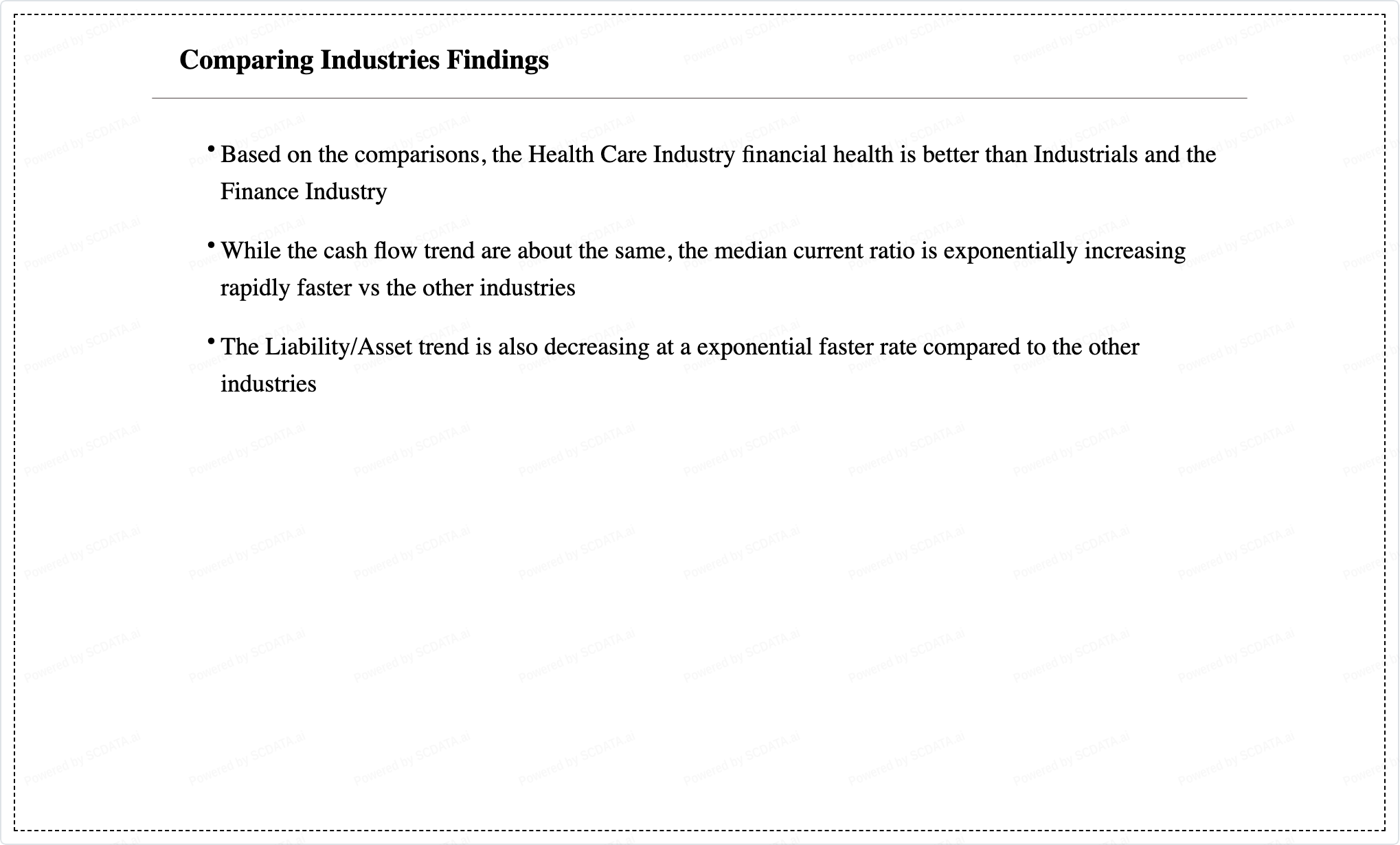 Based on the comparisons, the Health Care Industry financial health is better than Industrials and the Finance Industry