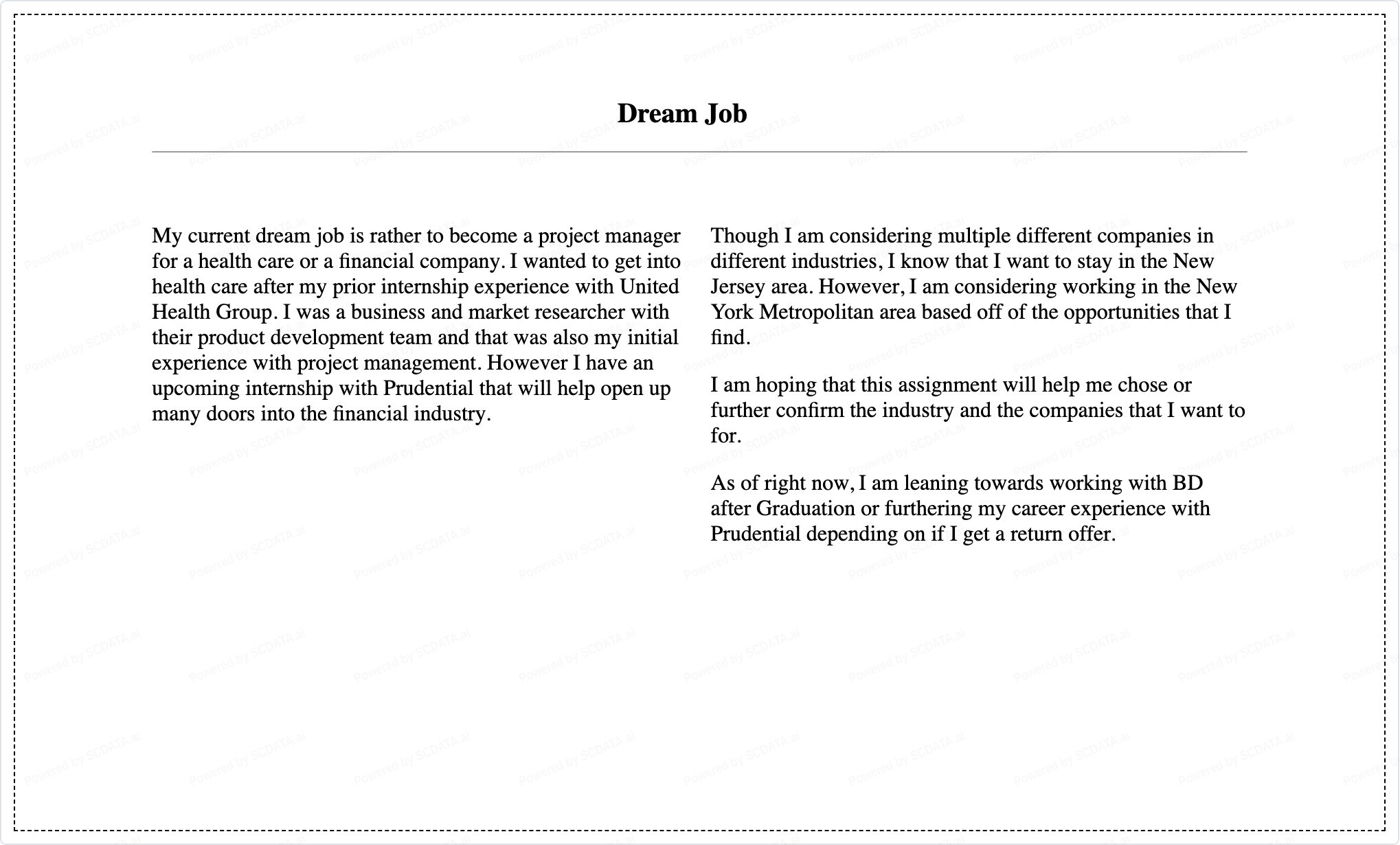 My current dream job is rather to become a project manager for a health care or a financial company. I wanted to get into health care after my prior internship experience with United Health Group. I was a business and market researcher with their product development team and that was also my initial experience with project management. However I have an upcoming internship with Prudential that will help open up many doors into the financial industry.