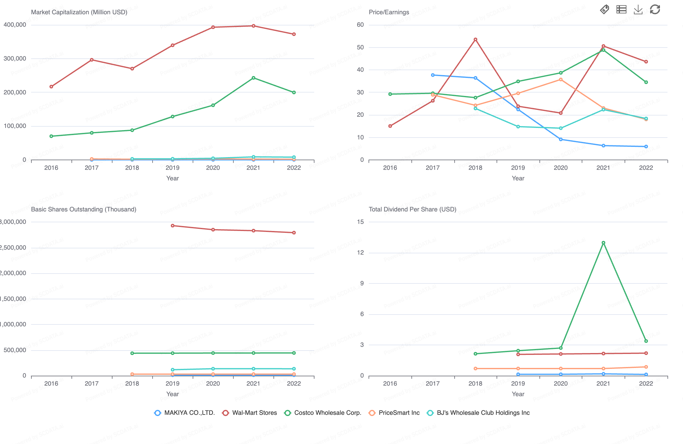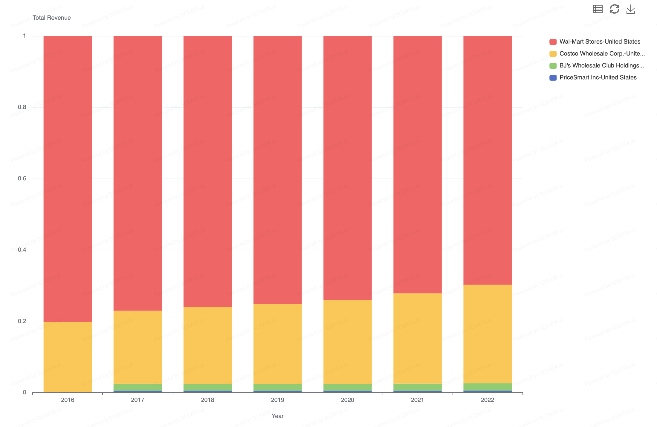 The chart suggests a market where Walmart leads by a wide margin, followed by Costco with a solid but notably smaller market share. BJ’s and PriceSmart hold smaller portions of the market. The visual data does not suggest any dramatic shifts in market share between these companies from 2016 to 2022, implying a stable competitive environment where smaller companies maintain their position without significant growth or erosion of their market shares. This stability suggests that while the market may be competitive, there's room for various-sized companies to survive and potentially thrive. We can also see walmarts share is gradually decreasing and costco increasing gradually.