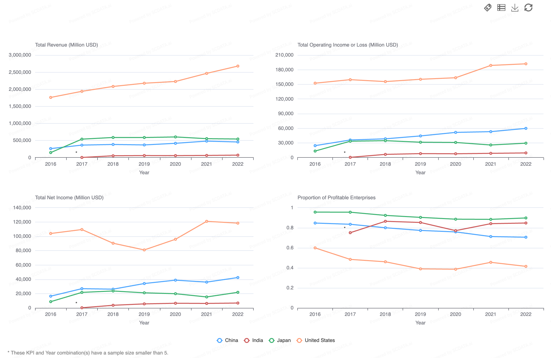 The Consumer Staples sector is expanding in China, with significant increases in revenue and profitability, though recent trends suggest possible challenges in maintaining profitability. The U.S. market shows stability in revenue and a high proportion of profitable enterprises but faces challenges in sustaining net income growth. Japan's sector appears to be stable with concerns over slightly decreasing profitability, while India shows potential for growth with increasing net income and profitability.