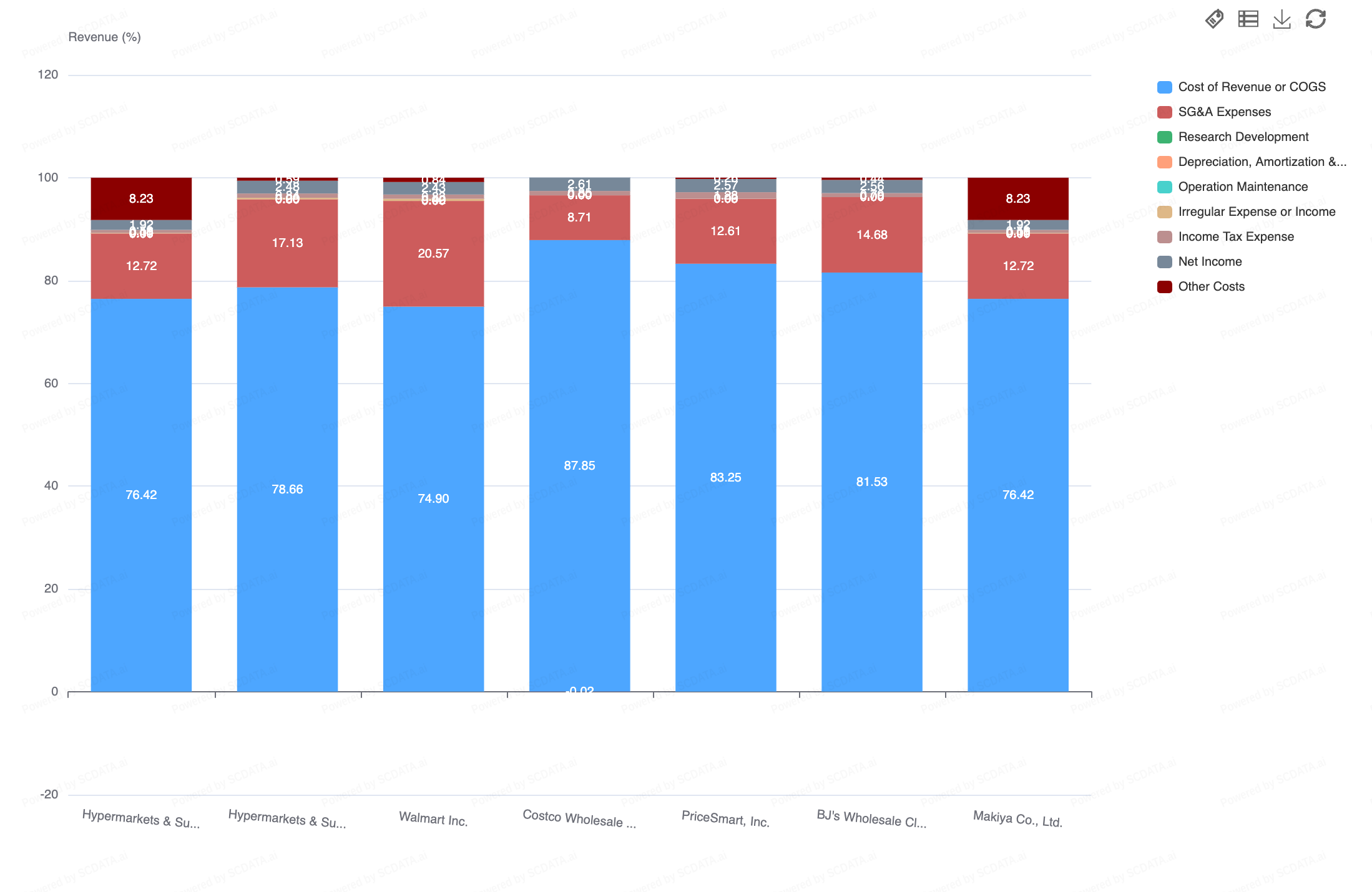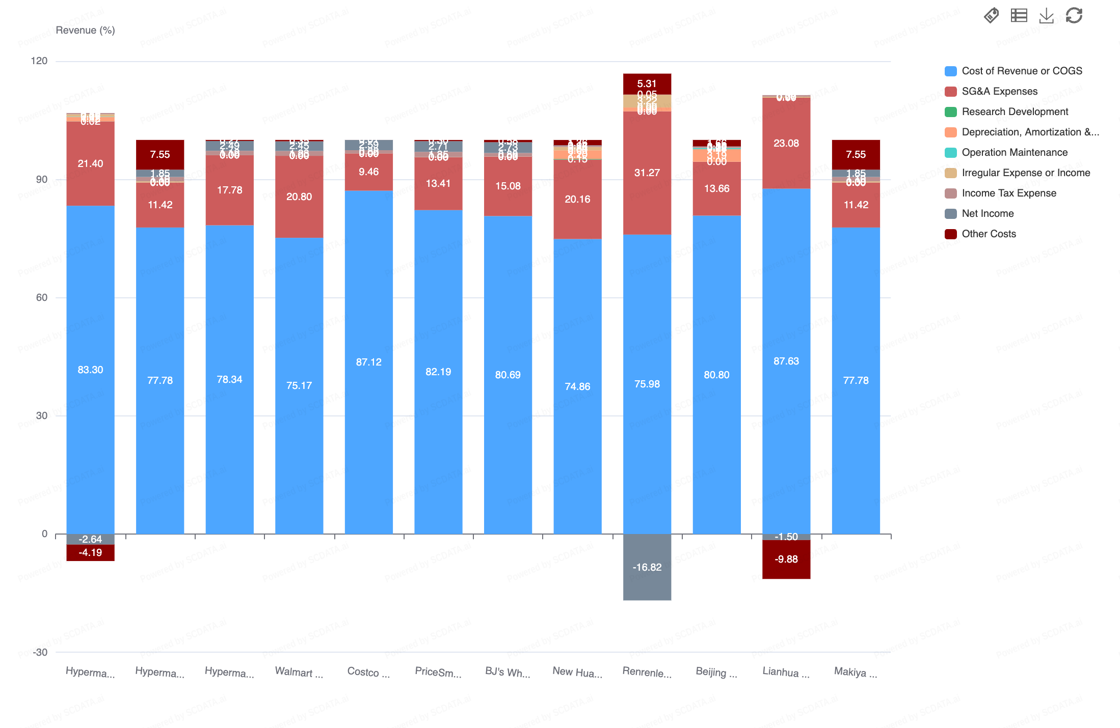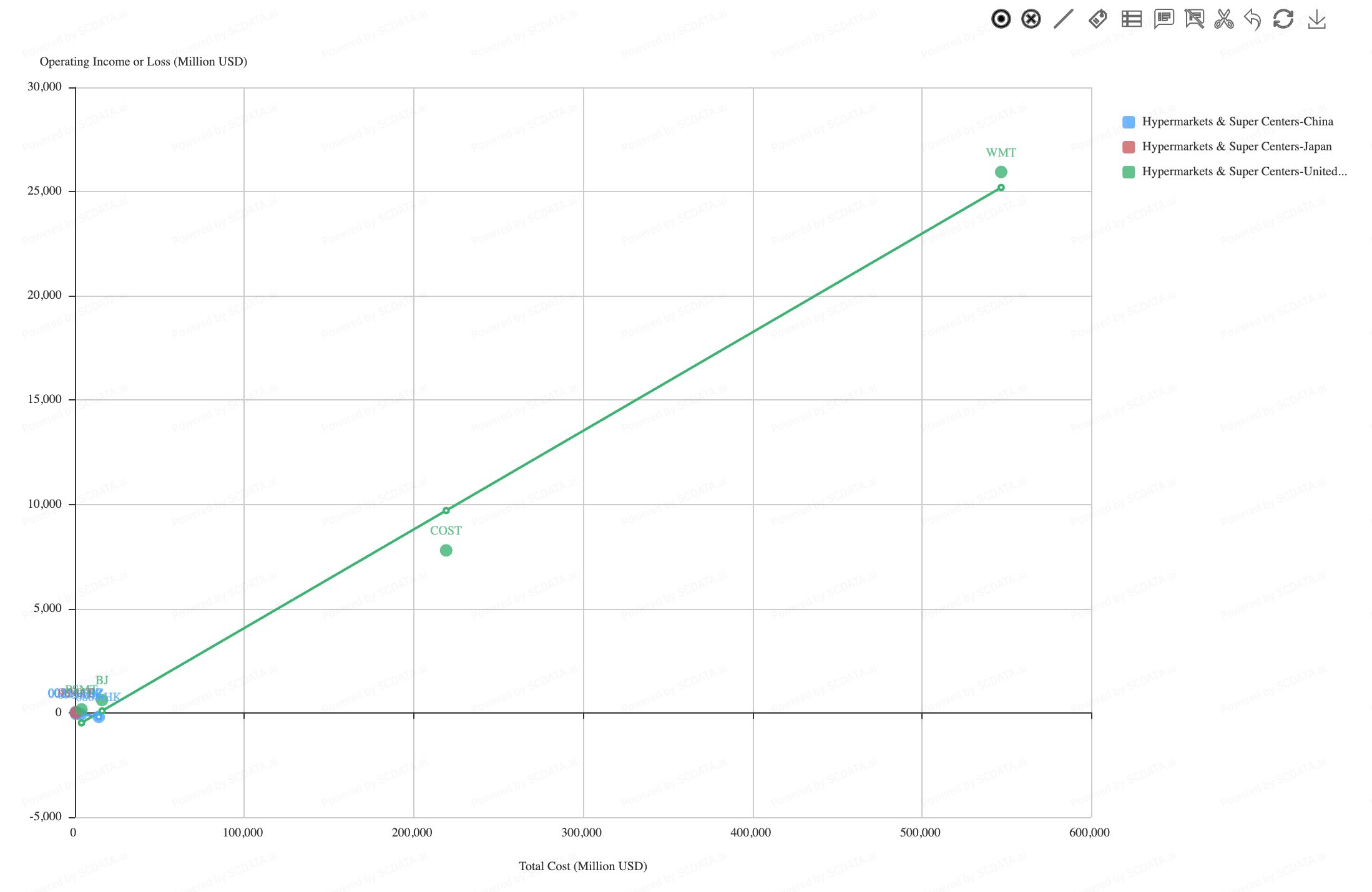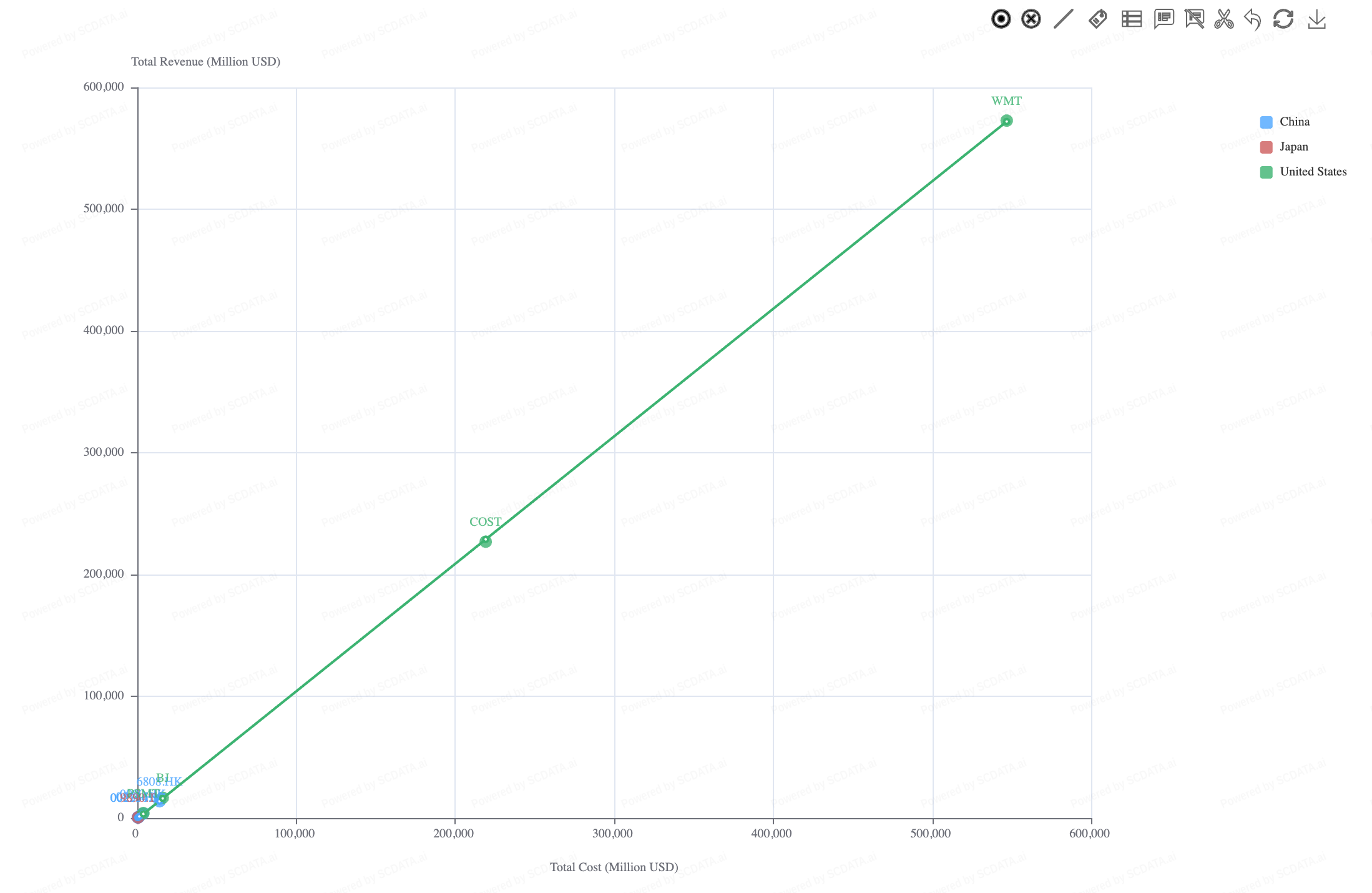 To provide a more detailed analysis of the hypermarket and supercenter industry across the US, Japan, and China, we conduct a comparative revenue-vs-cost assessment to gauge the relative market sizes and operational efficiencies within these regions. Our analysis reveals that US-based companies are markedly ahead in terms of revenue generation, which suggests a larger market size and potentially greater economies of scale. This commanding lead implies that US companies have a significant influence on market trends and consumer behaviors.