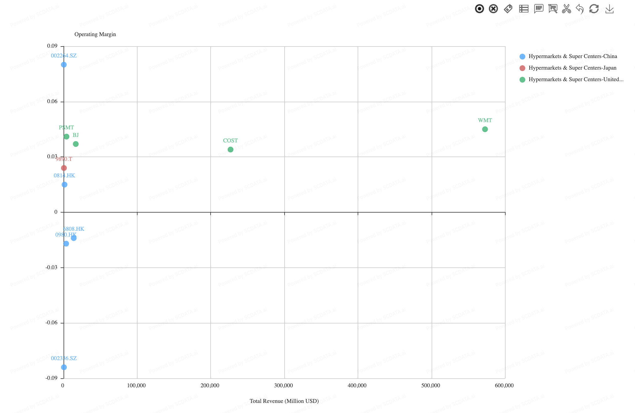 The scatter plot illustrates the operating margin against total revenue for companies in the hypermarkets and supercenters sector across China, Japan, and the United States. Walmart (WMT) stands out with high total revenue and a healthy operating margin. In contrast, Costco (COST) shows a substantial revenue with a comparatively lower operating margin. Chinese and Japanese companies cluster mostly towards the lower end of the revenue axis, indicating smaller scales of operation with varying margins.