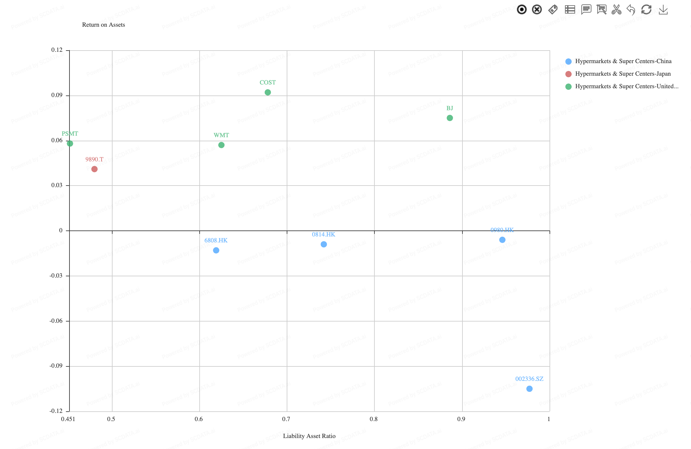The scatter plot compares companies in the hypermarkets and supercenters sector on the basis of their Return on Assets (ROA) and Liability Asset Ratio (LAR). Walmart (WMT) and Costco (COST) show a higher ROA, indicating efficient asset utilization. BJ's (BJ) has a moderate ROA with lower leverage, while companies represented by 6808.HK and 002336.SZ have lower or negative ROA, suggesting less efficient asset use or challenging market conditions.