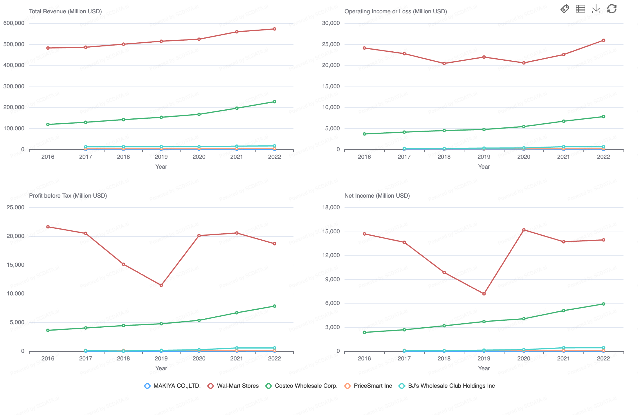 The line charts depict a financial performance comparison over several years among major retailers, including Walmart. Walmart (shown in red) maintains a substantial lead in total revenue, indicating its dominant market position. However, the profit before tax and net income for Walmart exhibit volatility, with a notable dip and recovery around 2019-2020. This fluctuation suggests that while Walmart's sales are consistently high, its profitability experienced challenges during that period, potentially from operational or market factors. The other companies shown in green, like Costco, also display growth in total revenue, but at a much lower scale compared to Walmart.