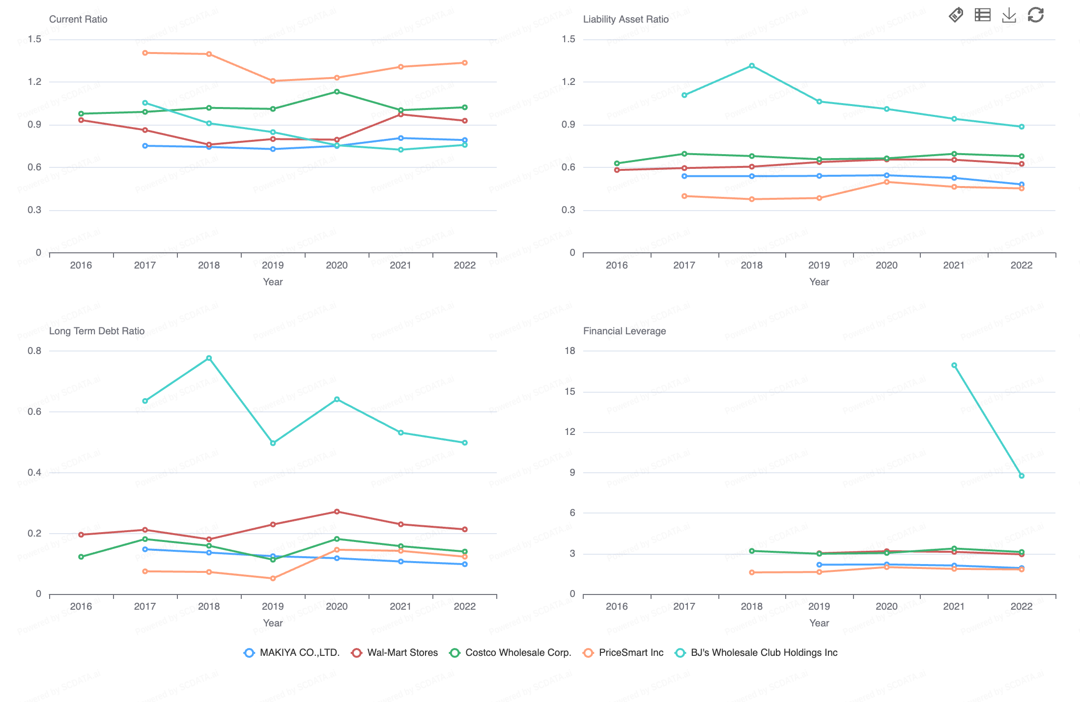 Walmart maintains a steady current and liability asset ratio, suggesting stable liquidity. Its long-term debt ratio is moderate, implying manageable debt levels. Financial leverage is variable but dramatically drops in 2022, indicating a significant change in capital structure, possibly due to debt reduction or equity increase. Overall, Walmart exhibits financial stability with potential deleveraging recently, suggesting a conservative financial strategy.