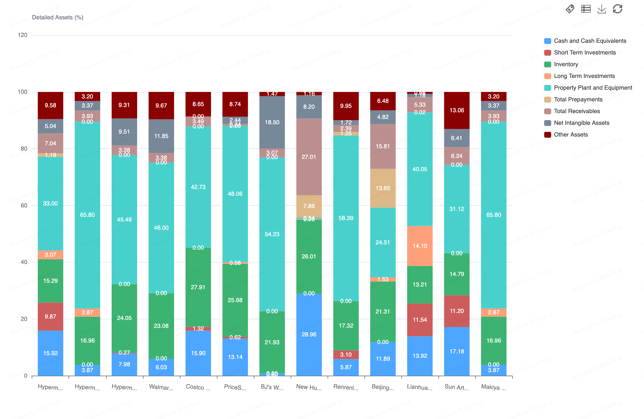 Walmart's bar indicates a significant portion of assets in 'Long Term Investments' and 'Property, Plant, and Equipment'. There's a smaller but notable amount in 'Inventory' and 'Total Receivables'. Compared to other companies, Walmart has a moderate amount in 'Cash and Cash Equivalents', and very little in categories like 'Short Term Investments', 'Net Intangible Assets', and 'Other Assets'. This suggests a solid base in tangible assets and a strategy focused on long-term investments.