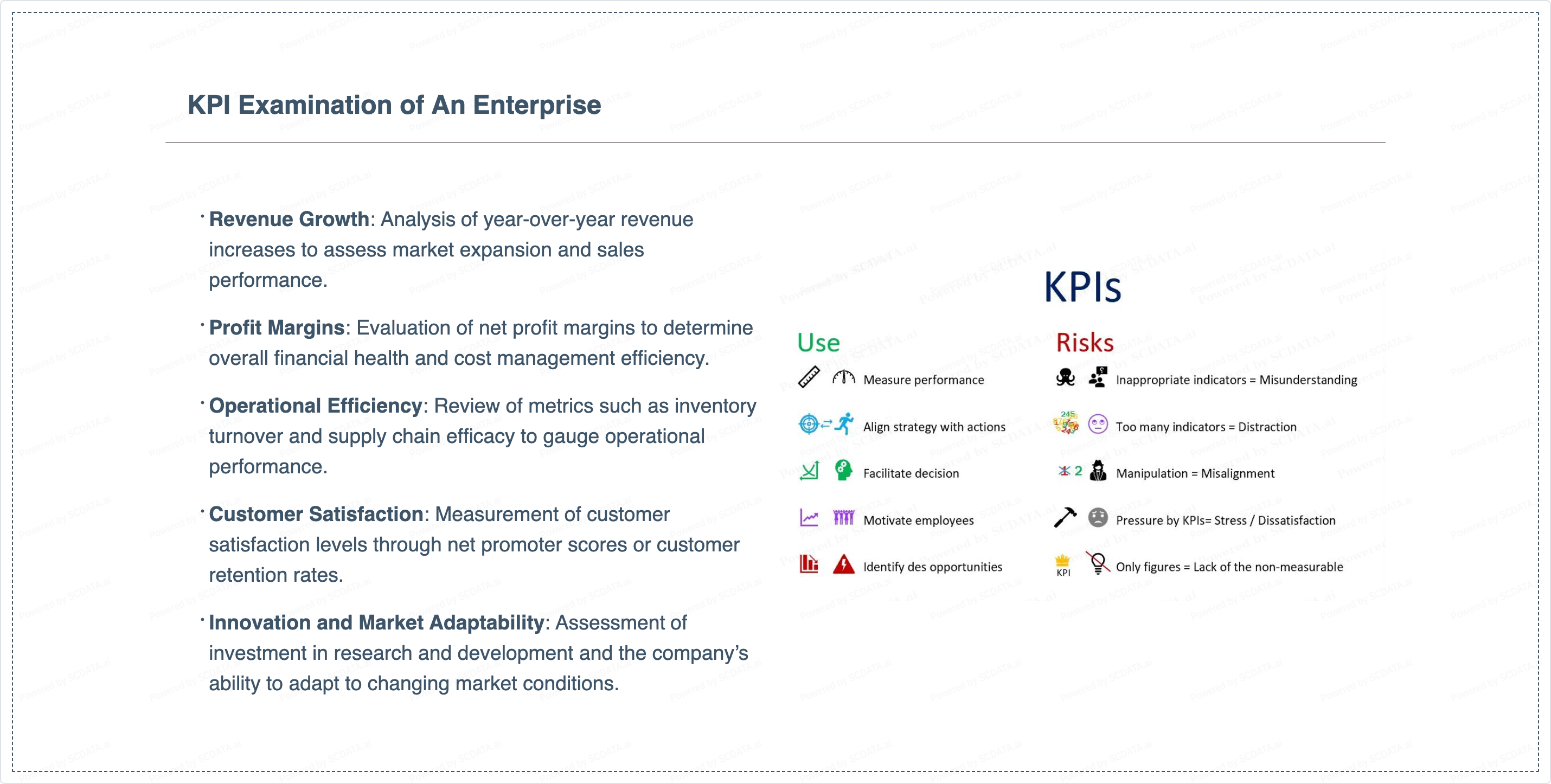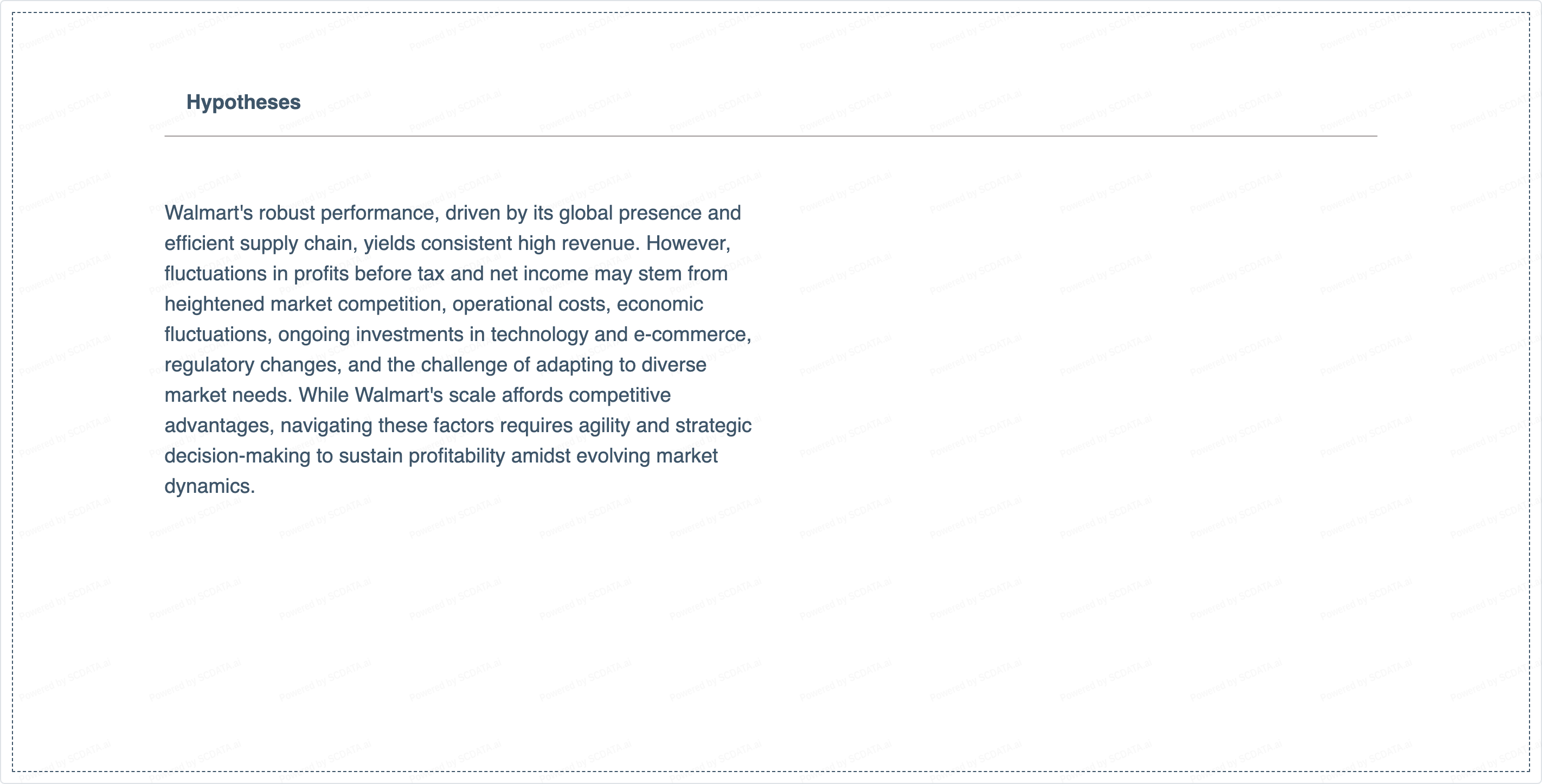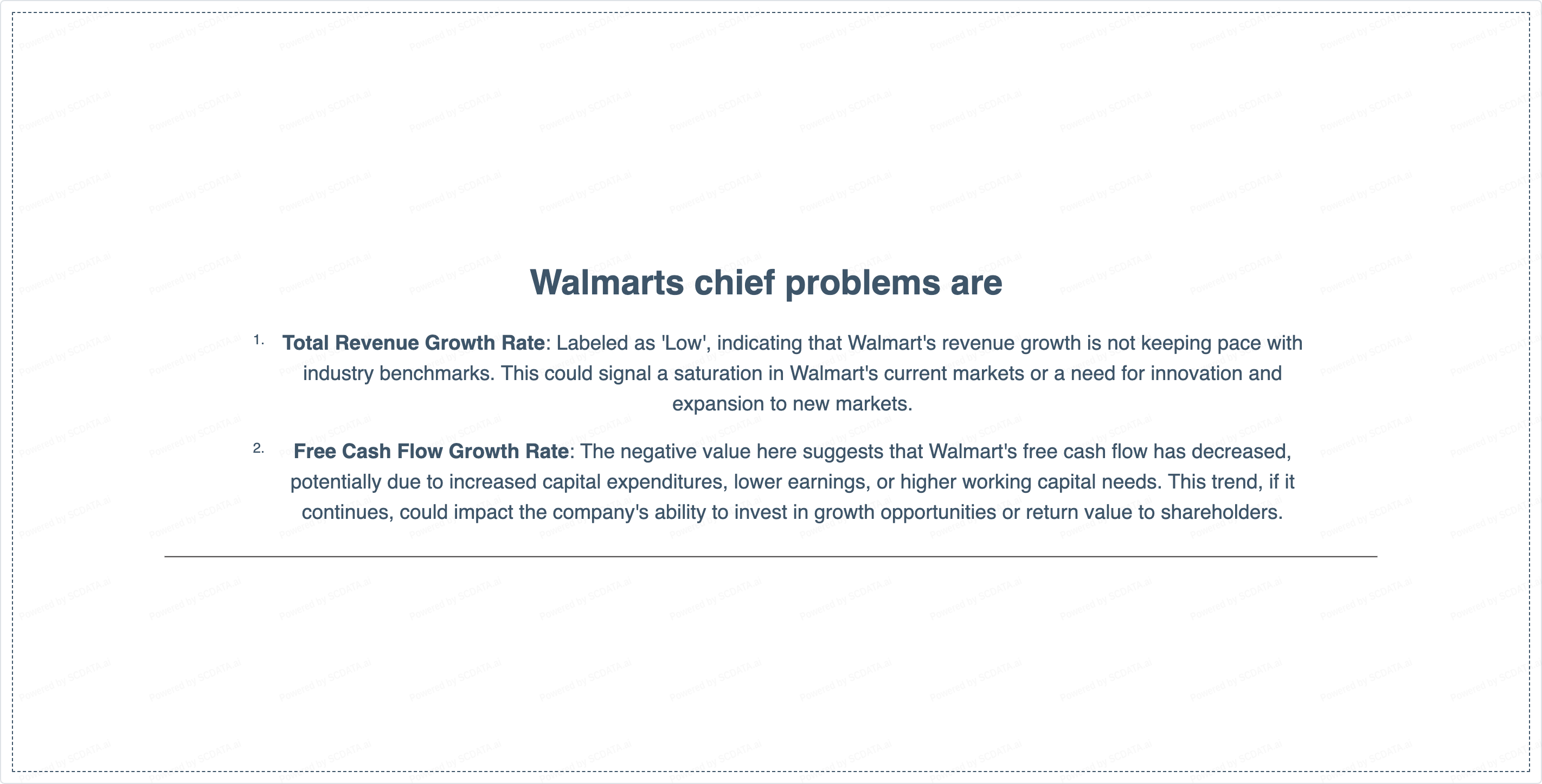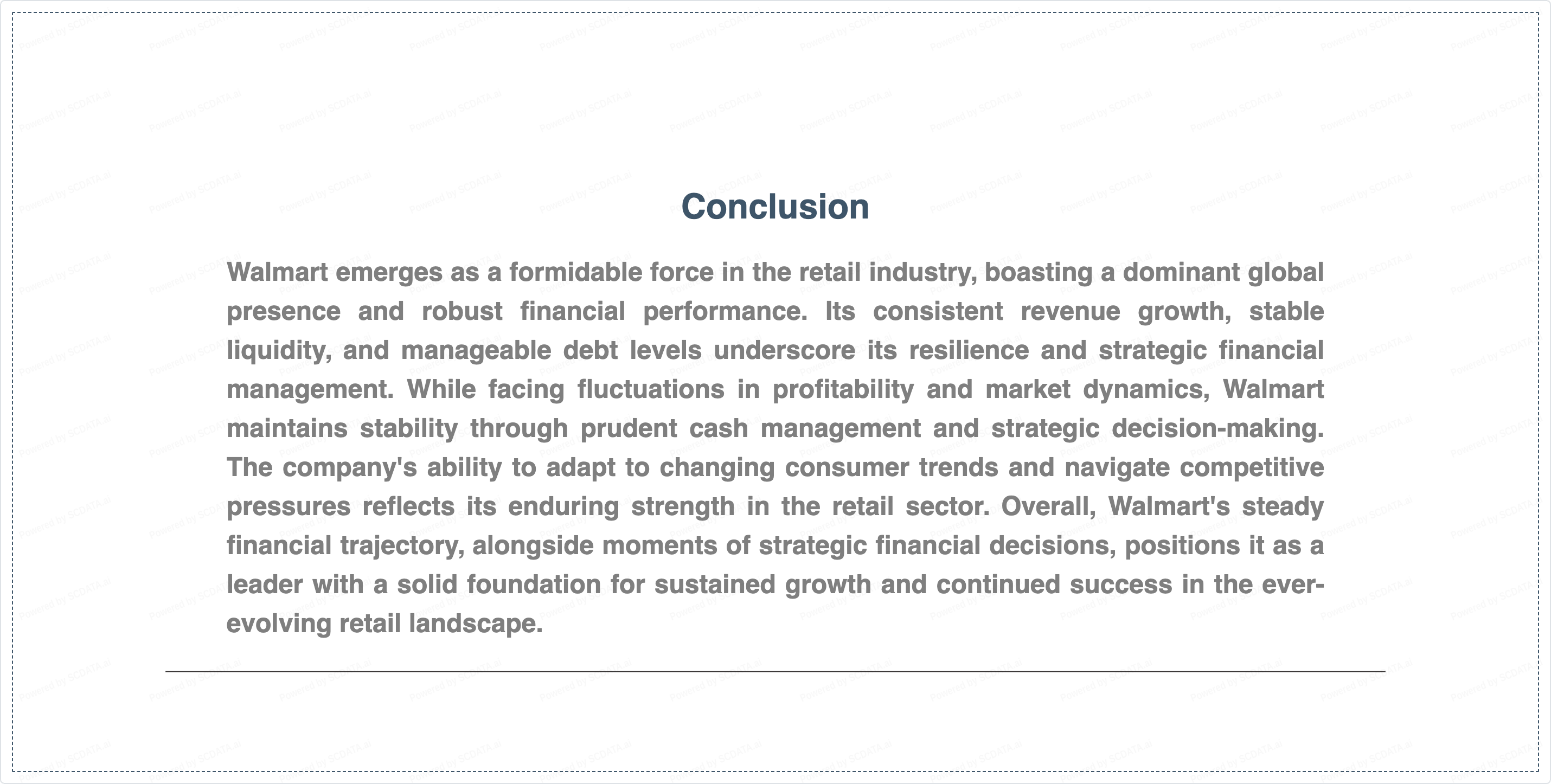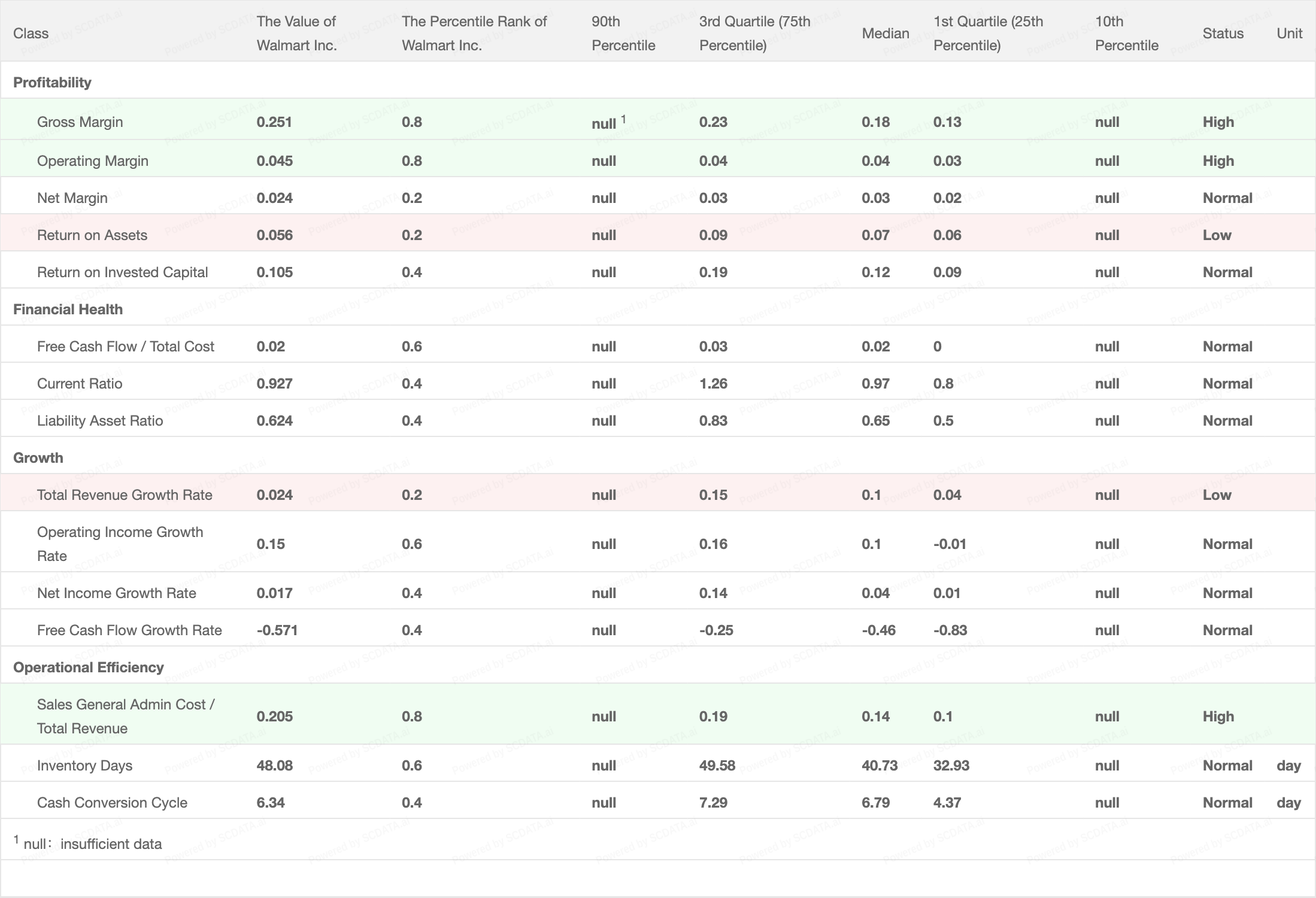 The table provides a KPI analysis for Walmart Inc., comparing it against industry benchmarks. Walmart exhibits high profitability with strong gross and operating margins. Financial health is sound, indicated by normal current and liability asset ratios. Growth metrics such as revenue and net income growth are low, suggesting stability rather than rapid expansion. Operational efficiency is mixed, with high SG&A costs, yet maintaining normal inventory turnover and cash conversion cycles.