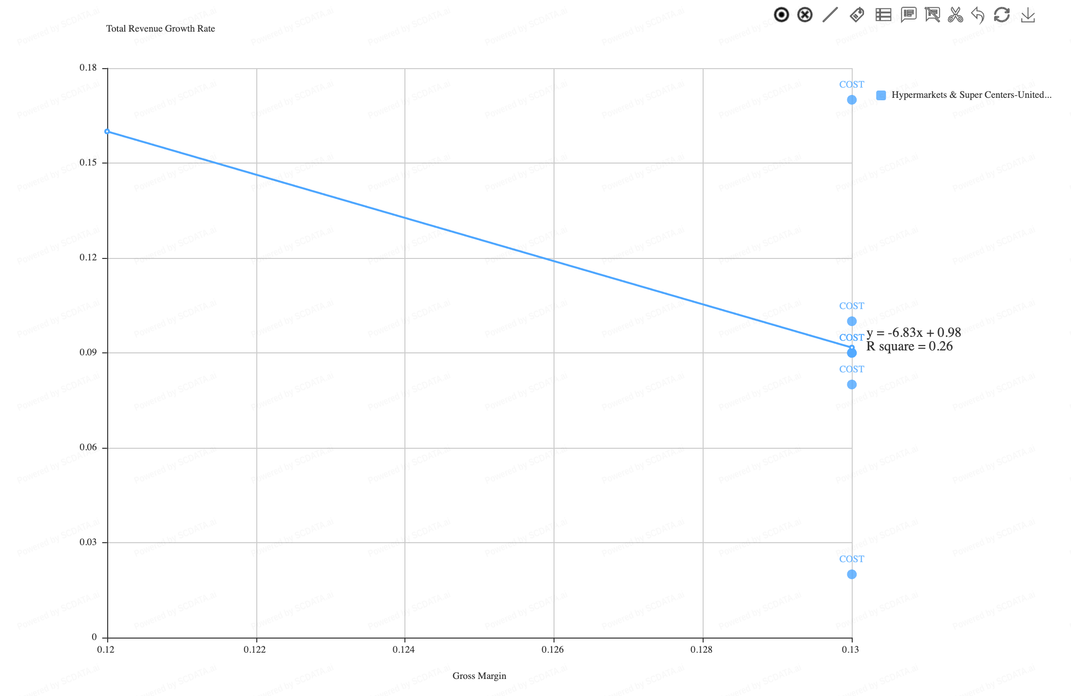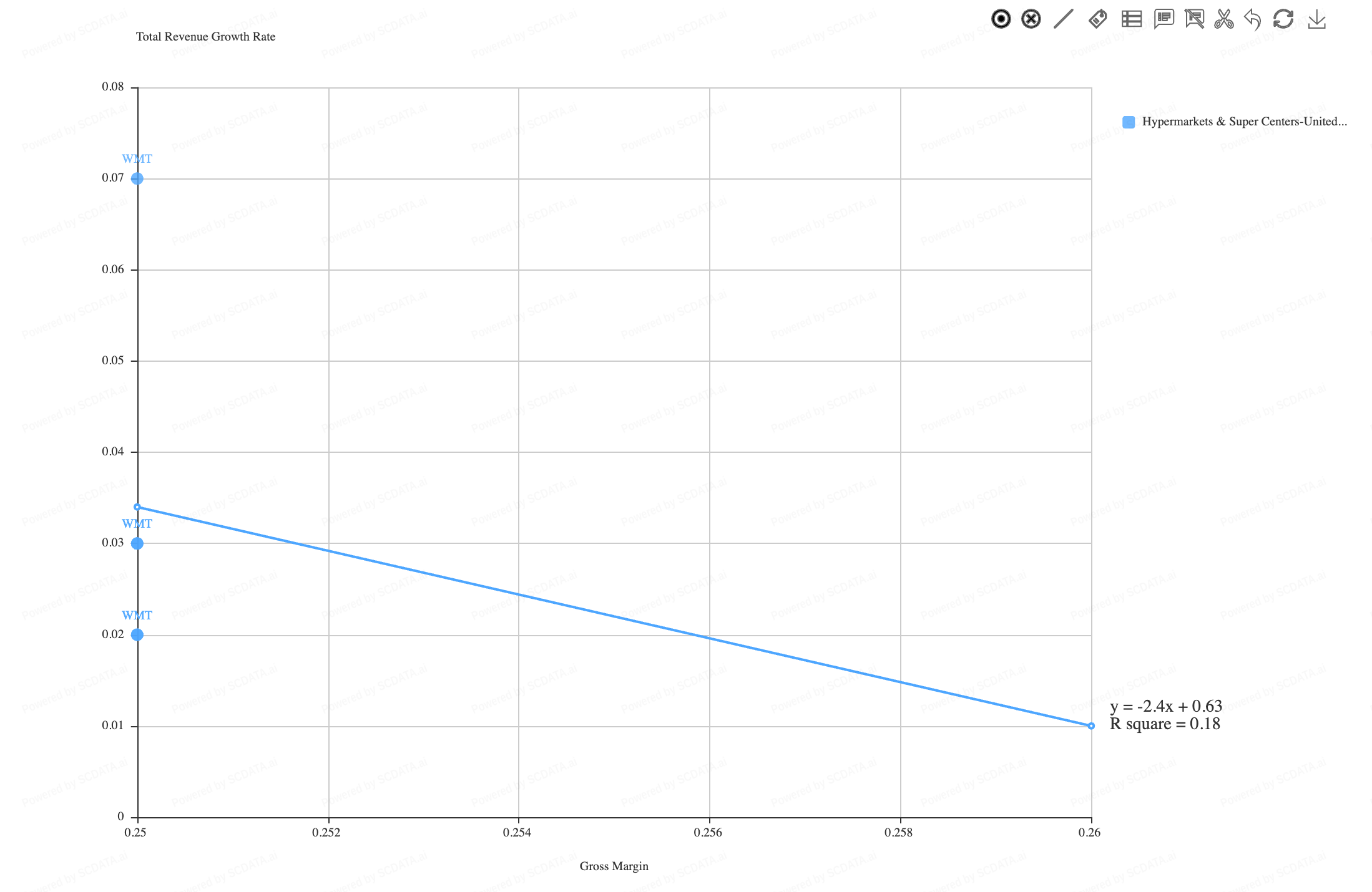 Plotting walmarts gross margin and total revenue growth rate over multiple years on the same graph, we found a strong neagtive correlation between them, that is, a higher gross margin is highly correlated with a higher revenue growth, implying a higher gross margin is not leading to a faster revenue growth.