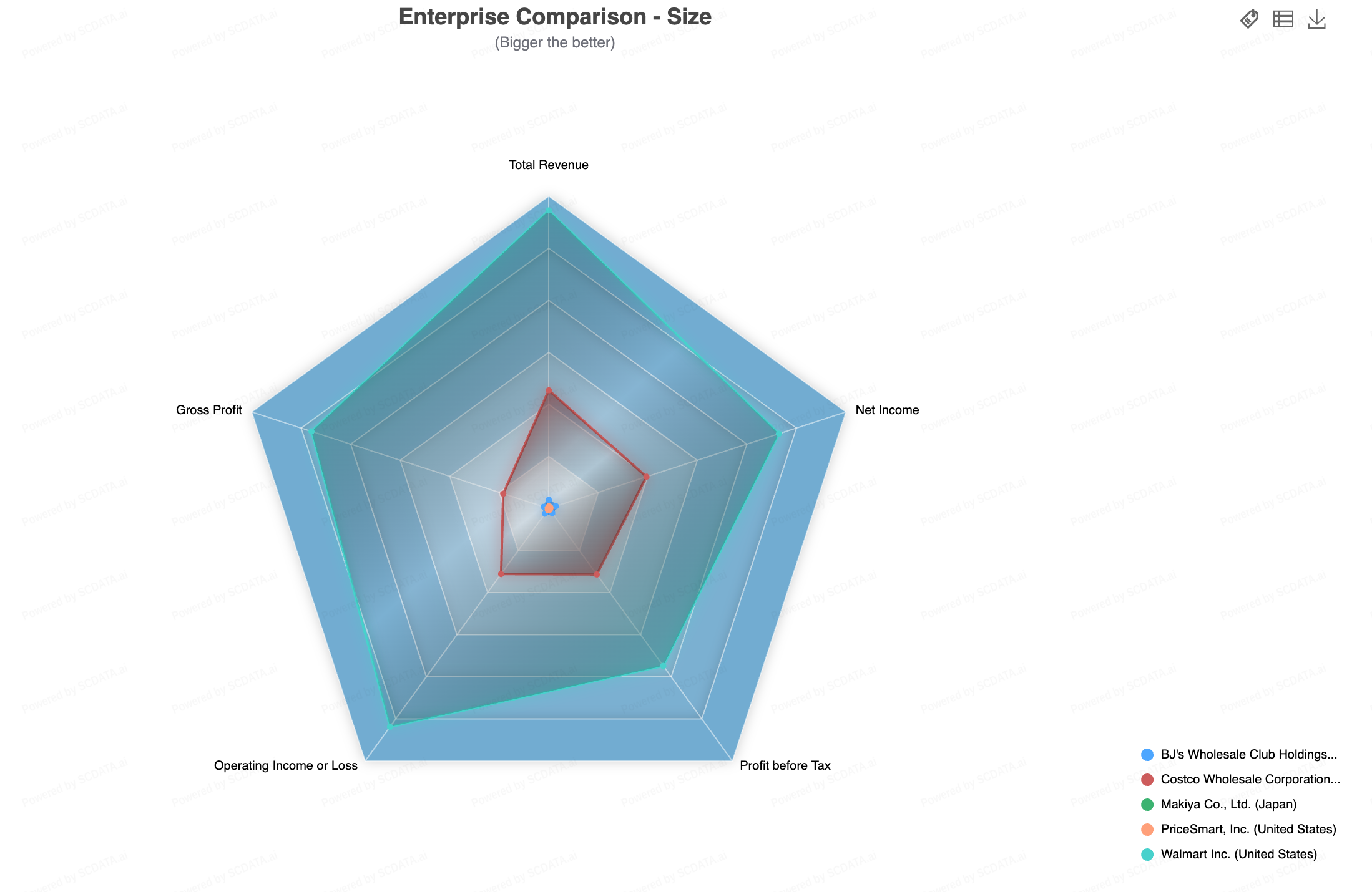 The radar chart provides a comparative analysis of key financial metrics across different enterprises within the retail sector. Walmart Inc. shows the most extensive coverage across all metrics, indicating a strong performance in total revenue, net income, and other financial areas. The chart suggests Walmart has a substantial lead over competitors like Costco, BJ's Wholesale Club, Makita, and PriceSmart. This visual comparison underscores Walmart's dominance in the market, reflecting its comprehensive scale and profitability relative to its peers.