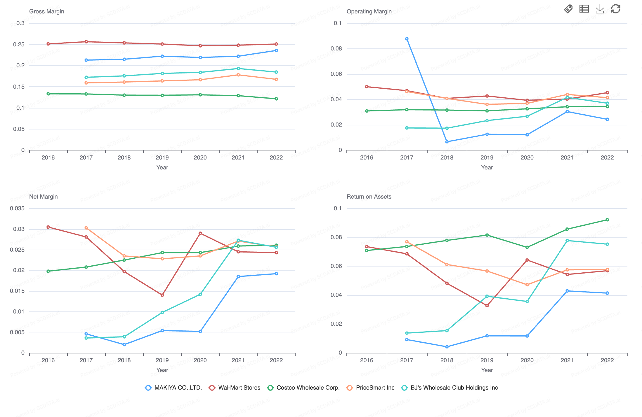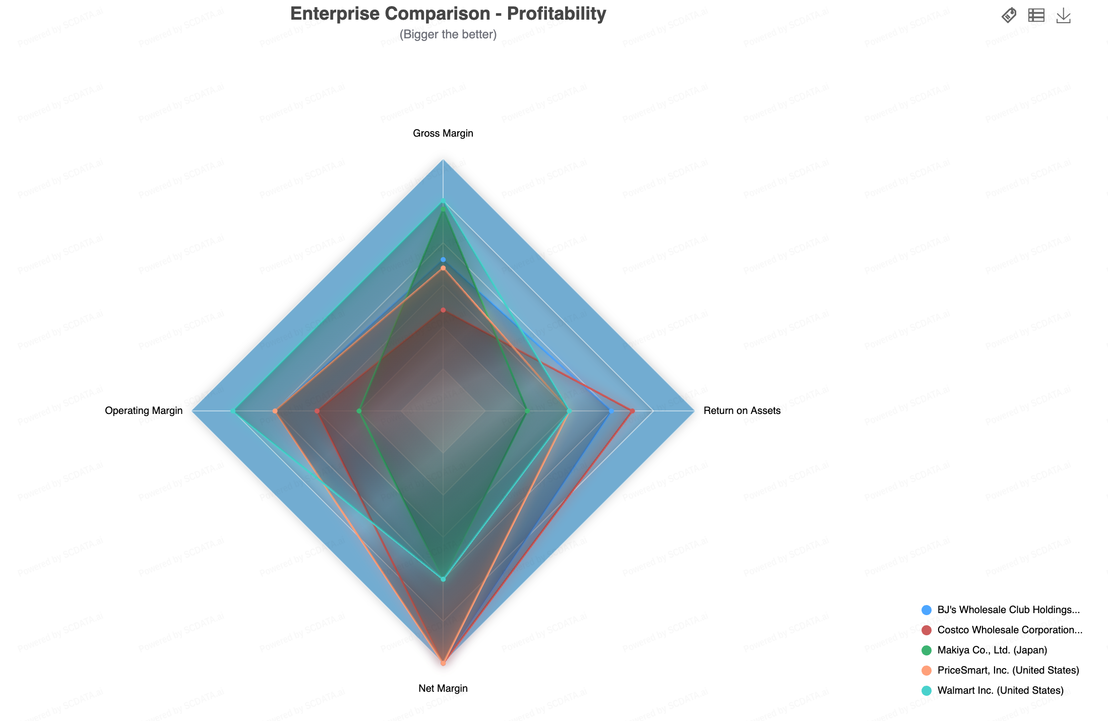 The graph shows that Walmart Co. Ltd. has the highest gross margin and net margin of the four companies. However, its return on assets are lower than Costco, Pricesmart and BJ's and Costco.