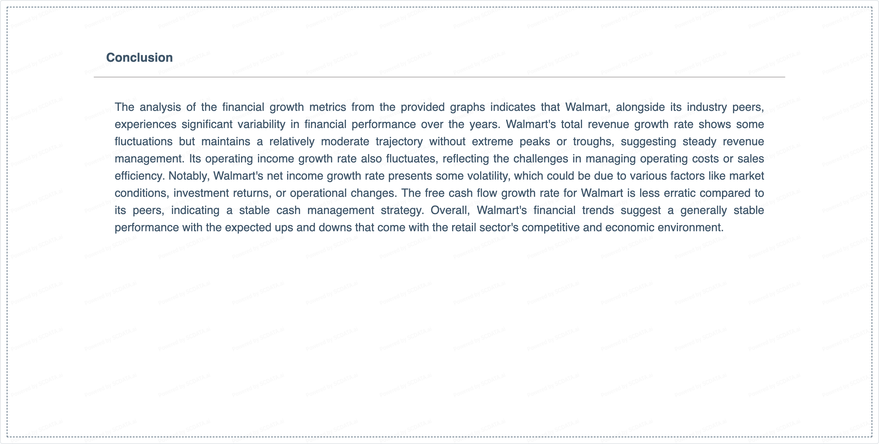 Walmart's total revenue growth rate demonstrates modest fluctuations compared to others, suggesting steady business without extreme growth or contraction. Its operating income growth rate mirrors this relative stability, though with some declines around 2021. Notably, Walmart's net income growth rate exhibits a significant spike in 2019, indicative of a profitable fiscal period, followed by a sharp decrease in 2020. The free cash flow growth rate for Walmart shows resilience, with less volatility than competitors, reflecting a consistent cash generation with a slight decline towards 2022.