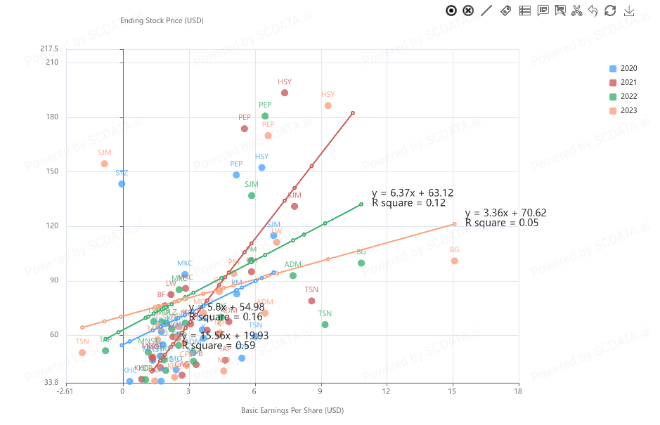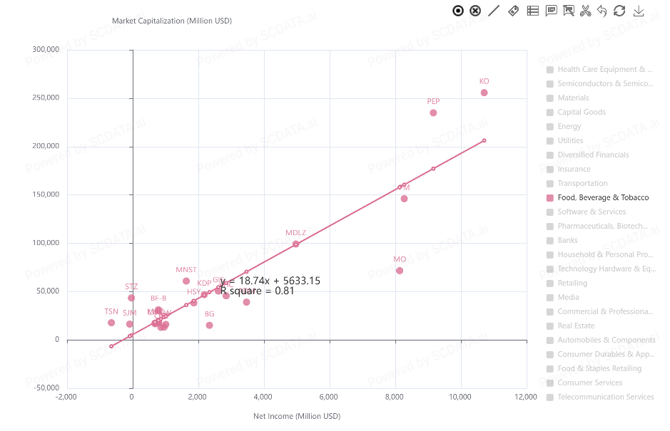 There is a moderate positive relationship between a company’s net income and its market capitalization, reflected by an R-squared value of 0.81. Pepsi (PEP) and Coco-Cola (KO) perform above the trendline, while Phillip Moriis (PM) is below