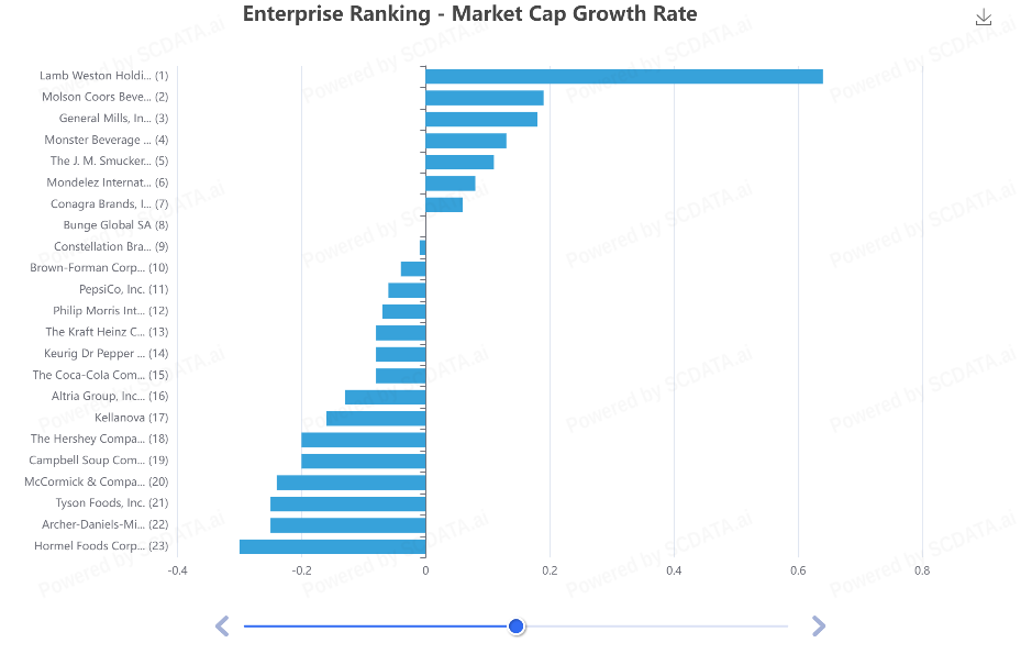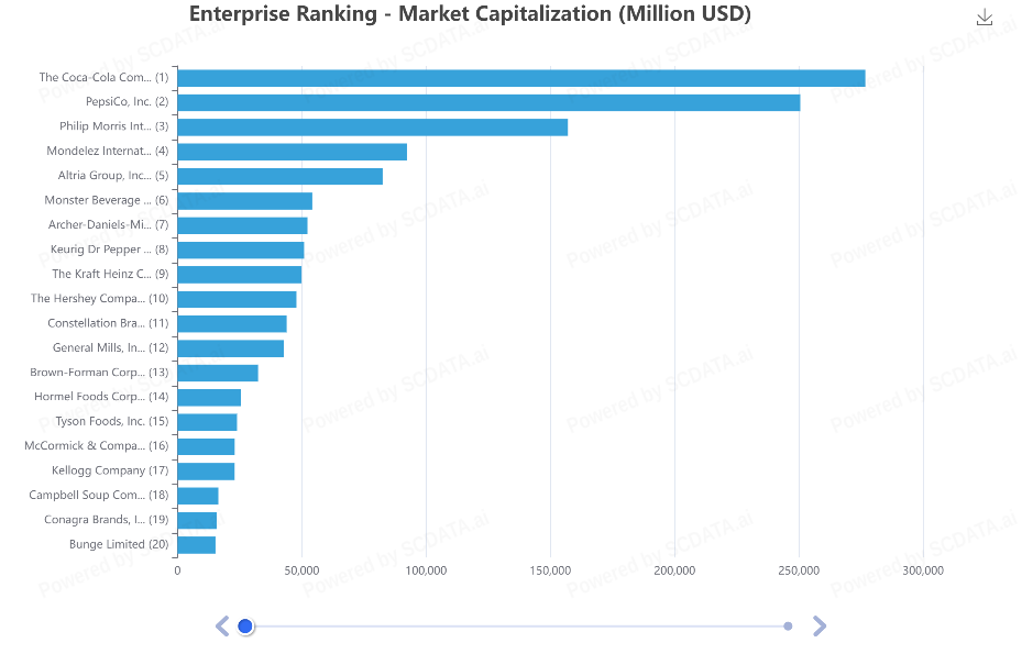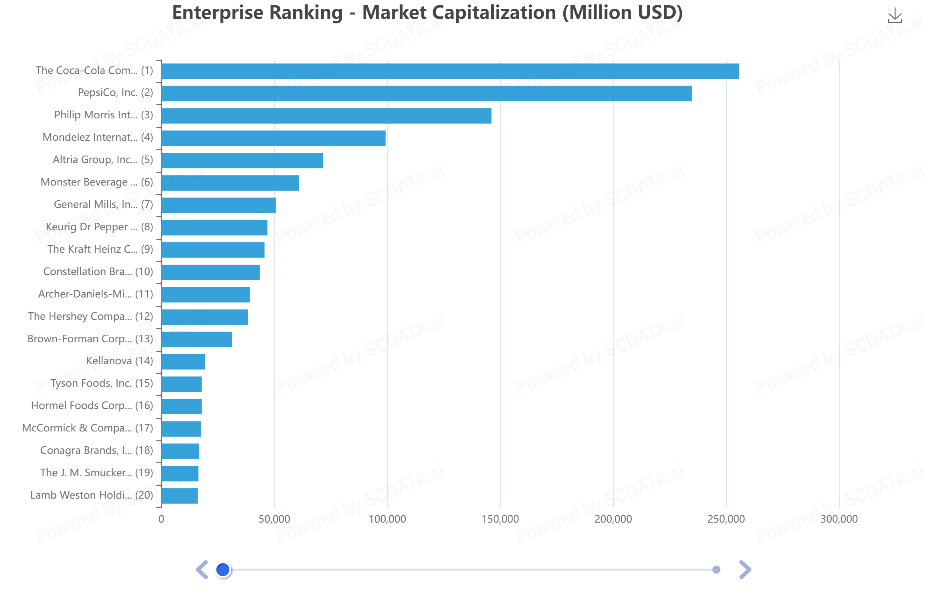 Leading the list are The Coco-Cola Company, Pepsi Corporation, and Phillip Morris International., which show significantly higher valuations compared to others like Hershey and General Mills. This highlights how a few leading companies control a large portion of the industry's overall market value.