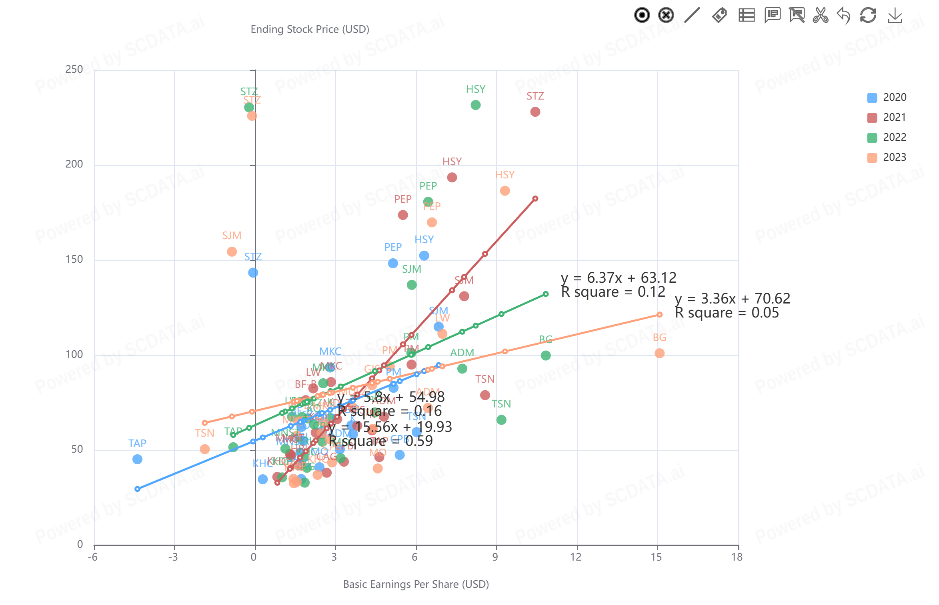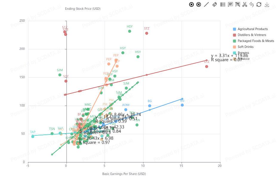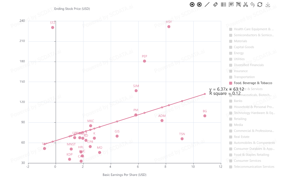 With an R-squared value of 0.12, the model shows a very weak link between EPS and stock price in the Food, Beverage, and Tobacco sector. The coefficient of 6.37 indicates that for every $1 rise in EPS, stock prices tend to increase by about $6.37. Additionally, the intercept of $63.12 suggests that even companies with no earnings could still hold a market value around $63.12, likely due to factors like brand reputation and market presence.