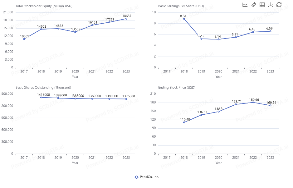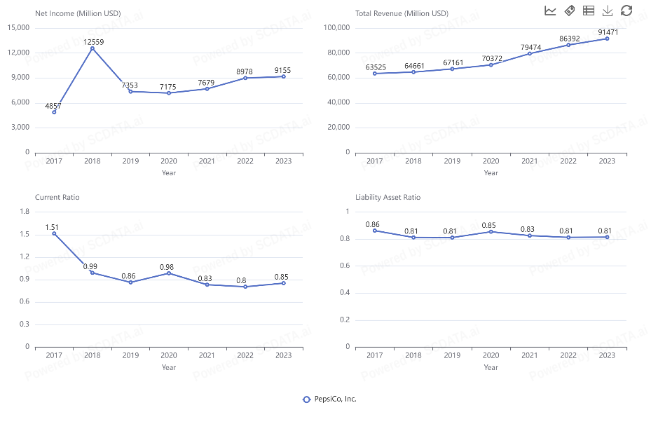 PepsiCo’s total revenue shows consistent growth from 2017 to 2023, rising from $63.5 billion to $91.5 billion. Despite a spike in net income in 2018, profitability has been more stable in recent years, with net income reaching $9.2 billion in 2023. The company’s current ratio has steadily declined since 2017, indicating tighter short-term liquidity. Meanwhile, the liability-to-asset ratio has remained stable around 0.81–0.85, suggesting PepsiCo maintains consistent leverage levels. Overall, the company demonstrates strong top-line growth with stable financial health, but it faces some pressure on liquidity management.