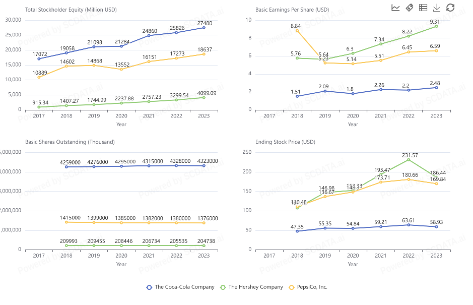 PepsiCo, Hershey, and Coca-Cola show different growth patterns across key financial metrics. PepsiCo stands out with consistently high EPS and strong stock price growth, peaking at over $230 before settling at $186.44 in 2023. Hershey, while smaller, has shown impressive growth in both stockholder equity and earnings, with a steady increase in stock price over the years. Coca-Cola, on the other hand, has maintained stable but slower growth, with modest increases in both EPS and stock price. Both PepsiCo and Hershey have reduced their shares outstanding over time, likely boosting shareholder value, while Coca-Cola’s share count has remained steady. Overall, PepsiCo appears to be the strongest performer, Hershey shows solid momentum, and Coca-Cola continues to offer reliable but slower-paced growth