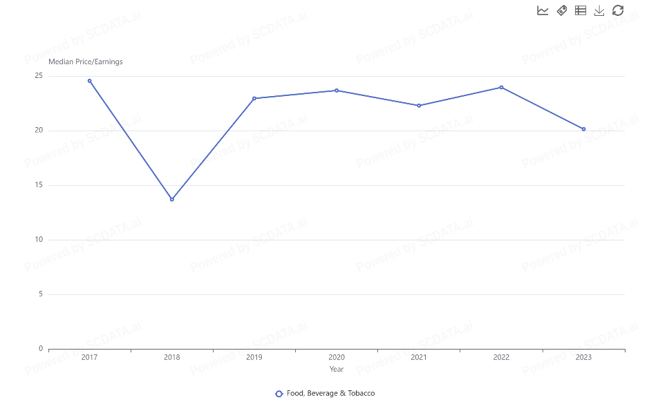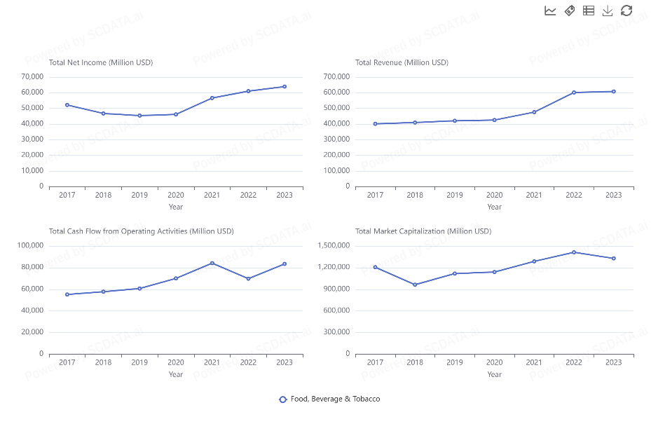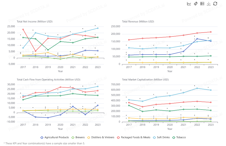 This chart compares the financial trends of different Consumer staple industry segments within the SP500- from 2017 to 2023. The Soft Drinks sector showed the most significant growth in both market capitalization and cash flow, being the leader in all years in total market cap and in 2022 and 2023 in cash flow. Distillers and Vintners does not have very good financials