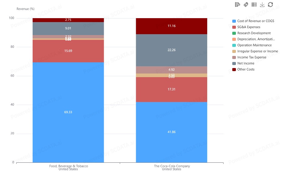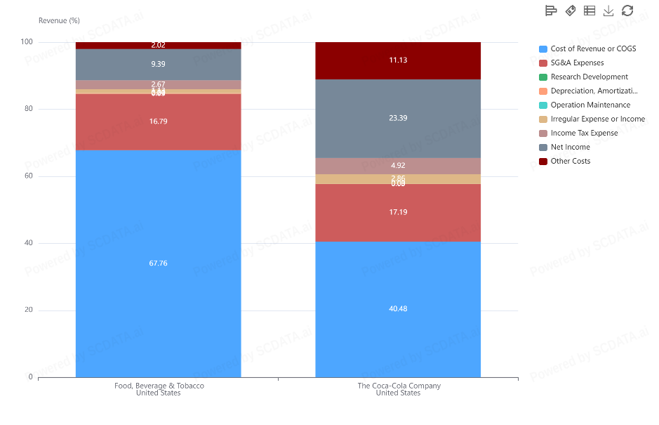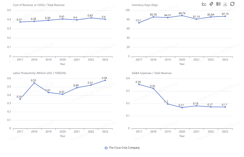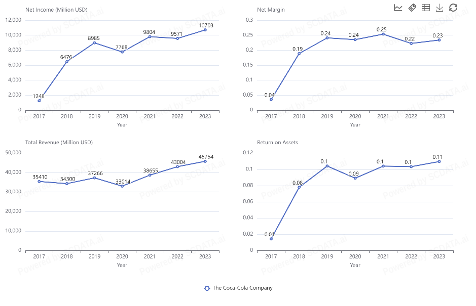 The chart tracks The Coco-Cola company financial performance from 2017 to 2023, highlighting metrics such as net income, total revenue, net margin, and return on assets (ROA). After its surge in 2018, Coco-Cola increased again the following year and then decreased and slowly increased to its peek in 2023. After 2018 spike it has been more stable.
