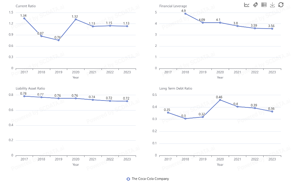 This chart examines Coco-Cola's financial health metrics from 2017 to 2023, including the current ratio, financial leverage, liability-to-asset ratio, and long-term debt ratio. The current ratio ranged from 1.3 to .76 in its lowest year and ended 3 consecutive years around 1.14, indicating stable short-term liquidity. Financial leverage peaked in 2018 but has been declining since then, suggesting improved capital structure management. Similarly, the liability-to-asset ratio stayed relatively stable around 0.75, and the long-term debt ratio, although it rose during the pandemic, gradually decreased by 2023