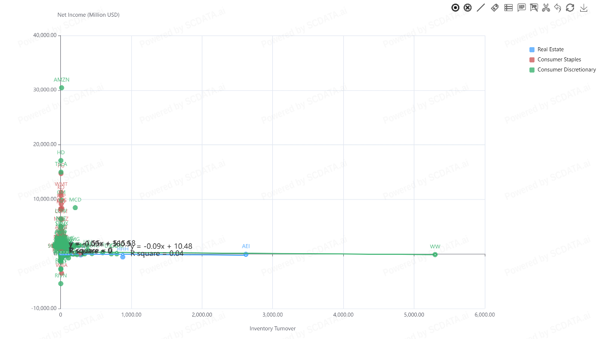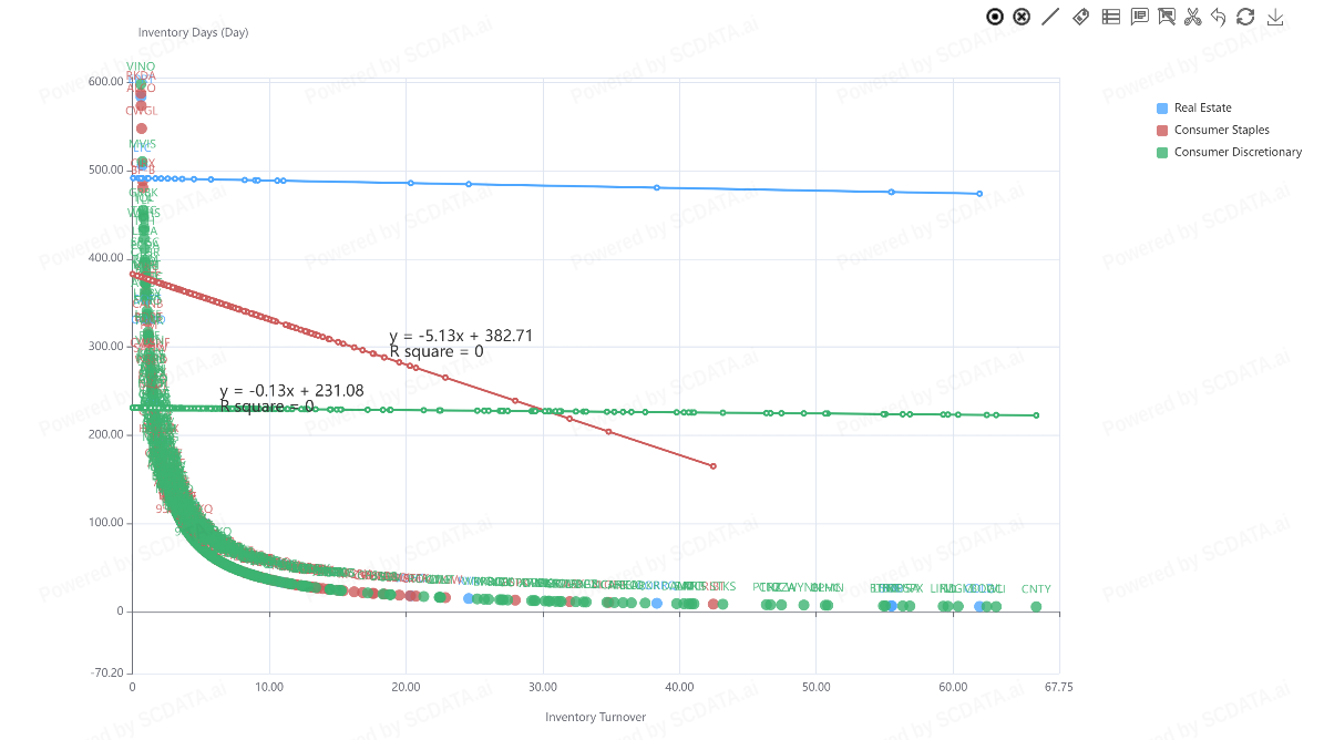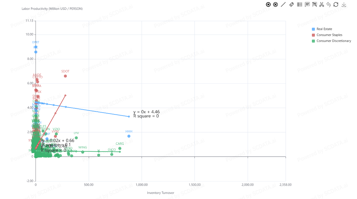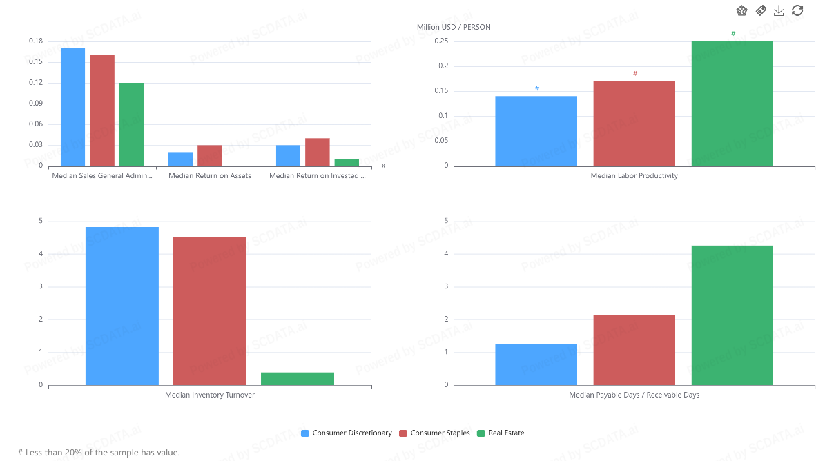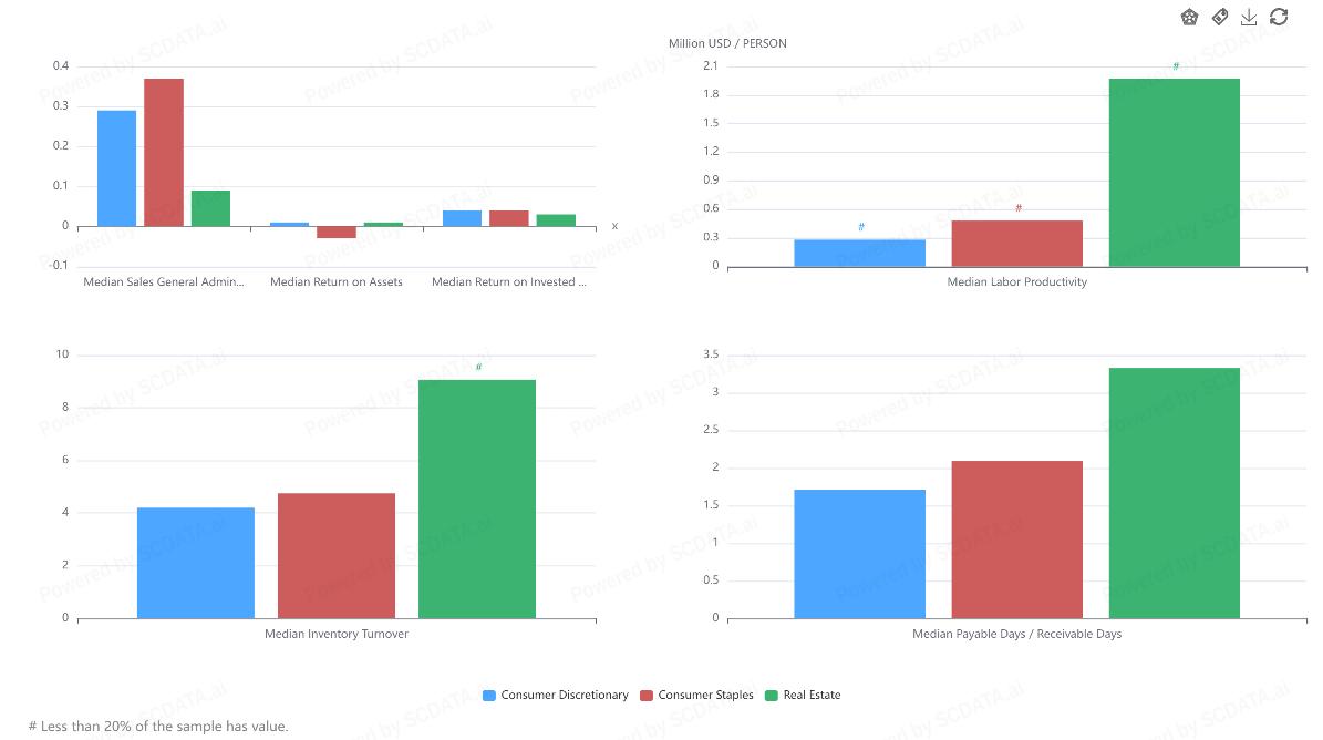 Aqui podemos notar las tendencias de la industria china para consumer discretionary, consumer staples y real state en cuanto a ventas medias, rendimiento de los activos, media productividad laboral, rotacion media del inventario, y los dias de pago vs las cuentas por cobrar
