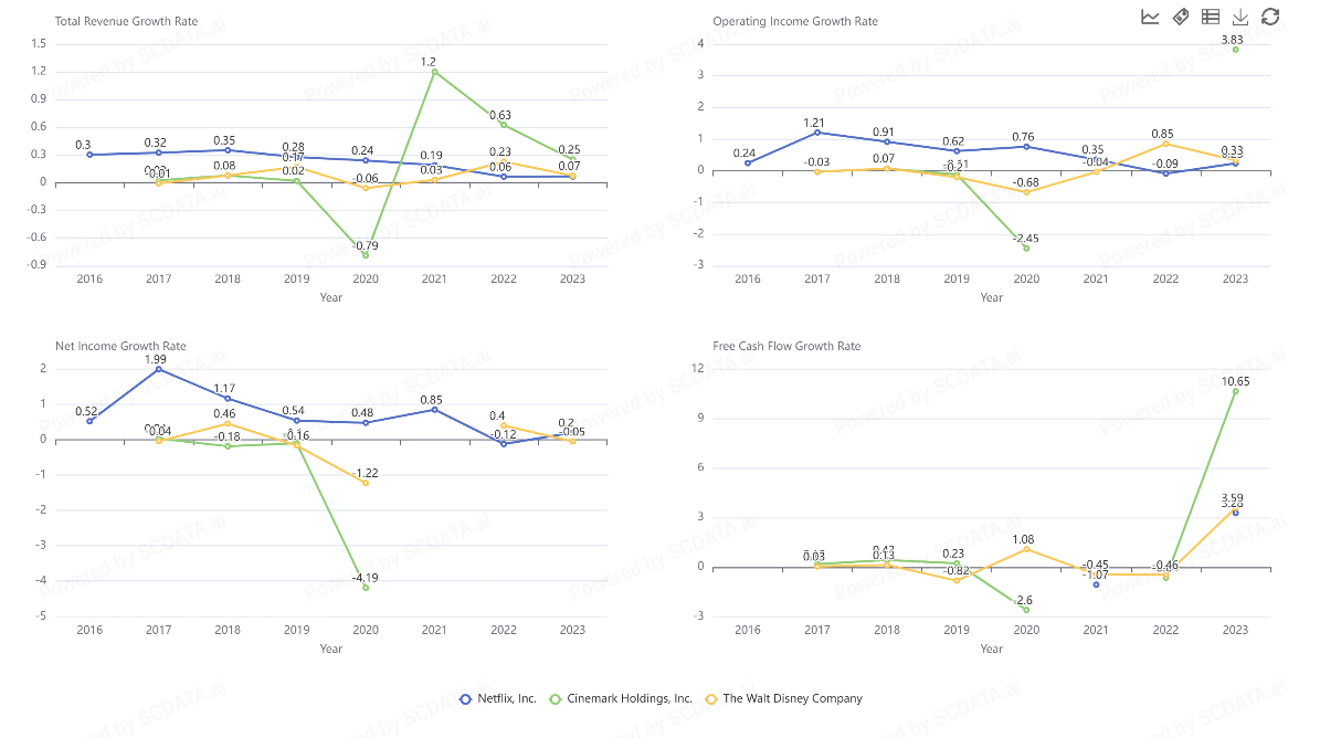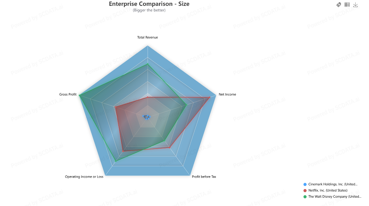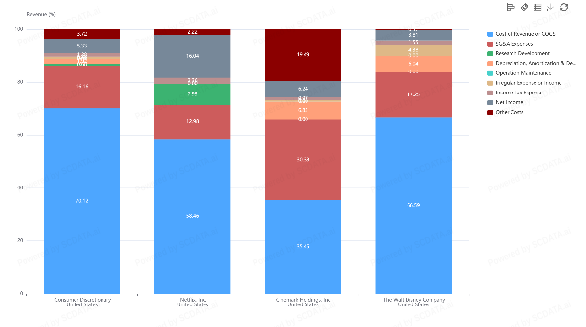 En este analisis queremos comparar algunas industrias del entretenimiento como son Netflix, cinemark y Disney y se puede observar como disney tiene en mayor proporcion del 66.59% en sus costos de bienes vendidos seguidos por sus gastos de venta generales y administrativos del 17.25%, mientras que cinemark tiene unos costos de bienes vendidos del 35.45% y una proporción mas alta de su SG&A con un 30.38% y adicional un componente importante de otros costos del 19.49, mientras que netflix sigue la tendencia de disney pero con unos GOCS del 58.46% y unos CG&A del 12.98%