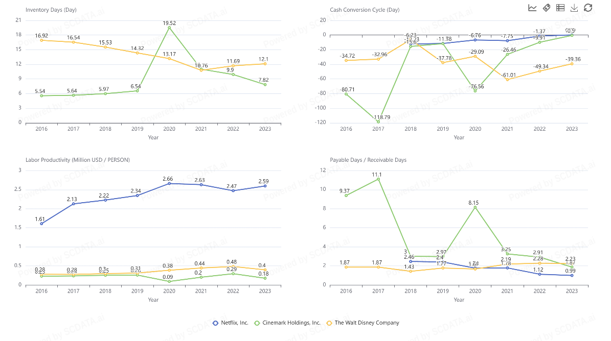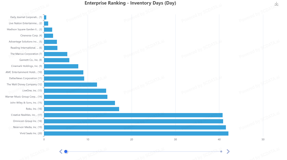 vemos en esta grafica que cinemark tiene en dias de inventario 7.82 y aparece en el puesto 9 mientras que disney tiene 12.10 dias de inventario y ocupa el puesto 12, netflix en este ranking no aparece en este top, debido a que no maneja dias de inventario en sus productos.