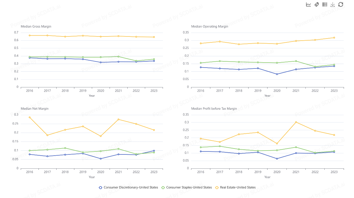 Aqui podemos notar las tendencias de la industria de los estados unidos en cuanto al consumer discretionary, consumer staples y real state en cuanto a margen bruto medio, margen medio operacional, margen medio neto y margen de beneficio medio antes de impuestos
