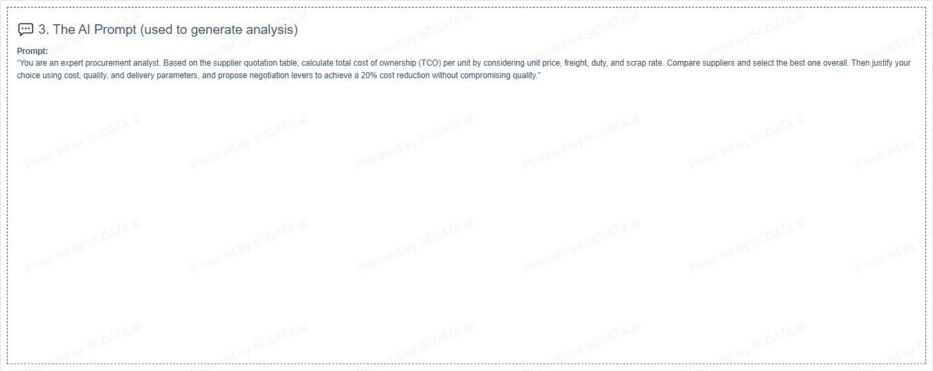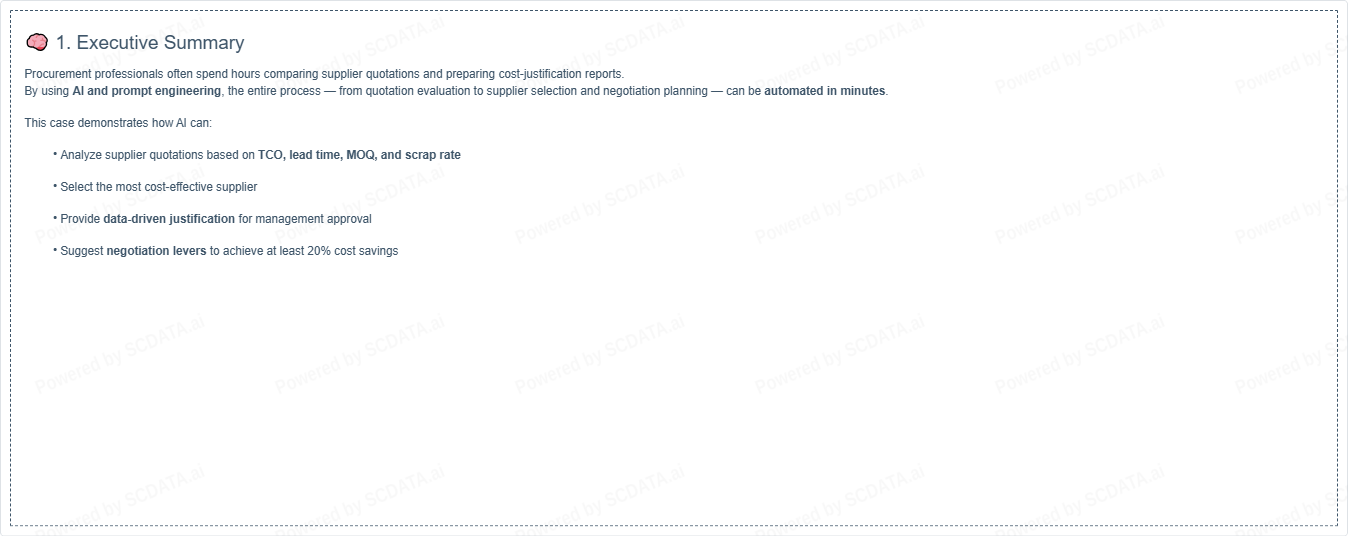 By using AI and prompt engineering, the entire process β from quotation evaluation to supplier selection and negotiation planning β can be automated in minutes.