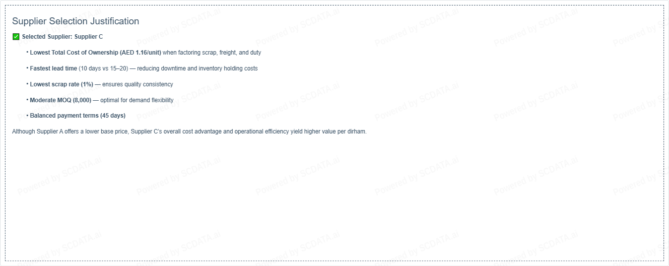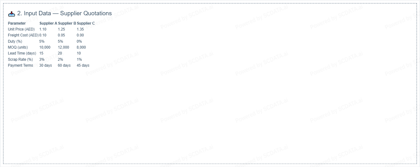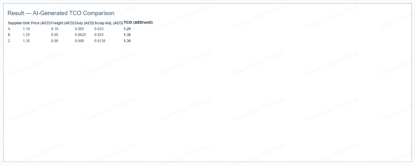 | Supplier | Unit Price (AED) | Freight (AED) | Duty (AED) | Scrap Adj. (AED) | TCO (AED/unit) |