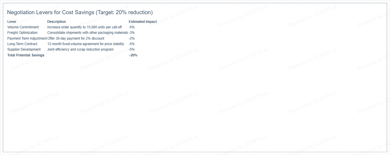 Suggest negotiation levers to achieve at least 20% cost savings