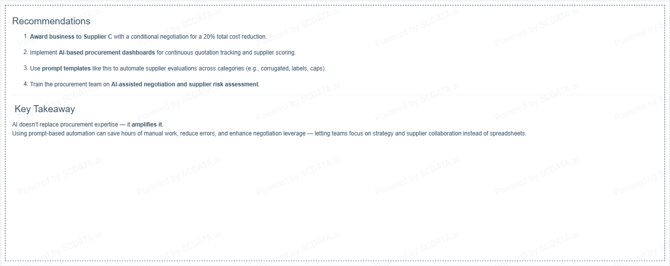 Using prompt-based automation can save hours of manual work, reduce errors, and enhance negotiation leverage β letting teams focus on strategy and supplier collaboration instead of spreadsheets.
