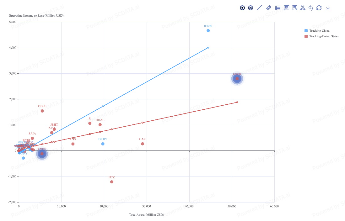Two results: (1) Uber performs better than Lyft in utilizing assets to generate profit. (2) Trucking in China is more scalable than trucking from the US.