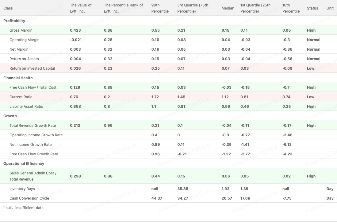 The KPI examination of Lyft relative to the U.S. technology/services industry shows a mixed performance. In profitability, Lyft’s gross margin is strong compared to peers, while operating margin, net margin, ROA, and ROIC are generally in line with or below industry benchmarks, indicating moderate profitability efficiency. From a financial health perspective, Lyft generates strong free cash flow, though its current ratio is low, suggesting weaker short-term liquidity despite manageable leverage. In terms of growth, Lyft significantly outperforms the industry in revenue growth, with operating income, net income, and free cash flow growth also well above peer levels. Operationally, Lyft maintains an efficient cost structure, although a relatively high cash conversion cycle points to some working capital inefficiencies.