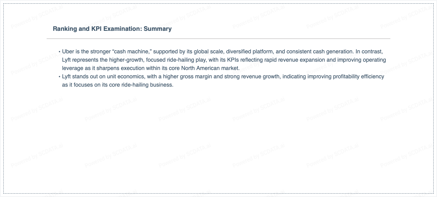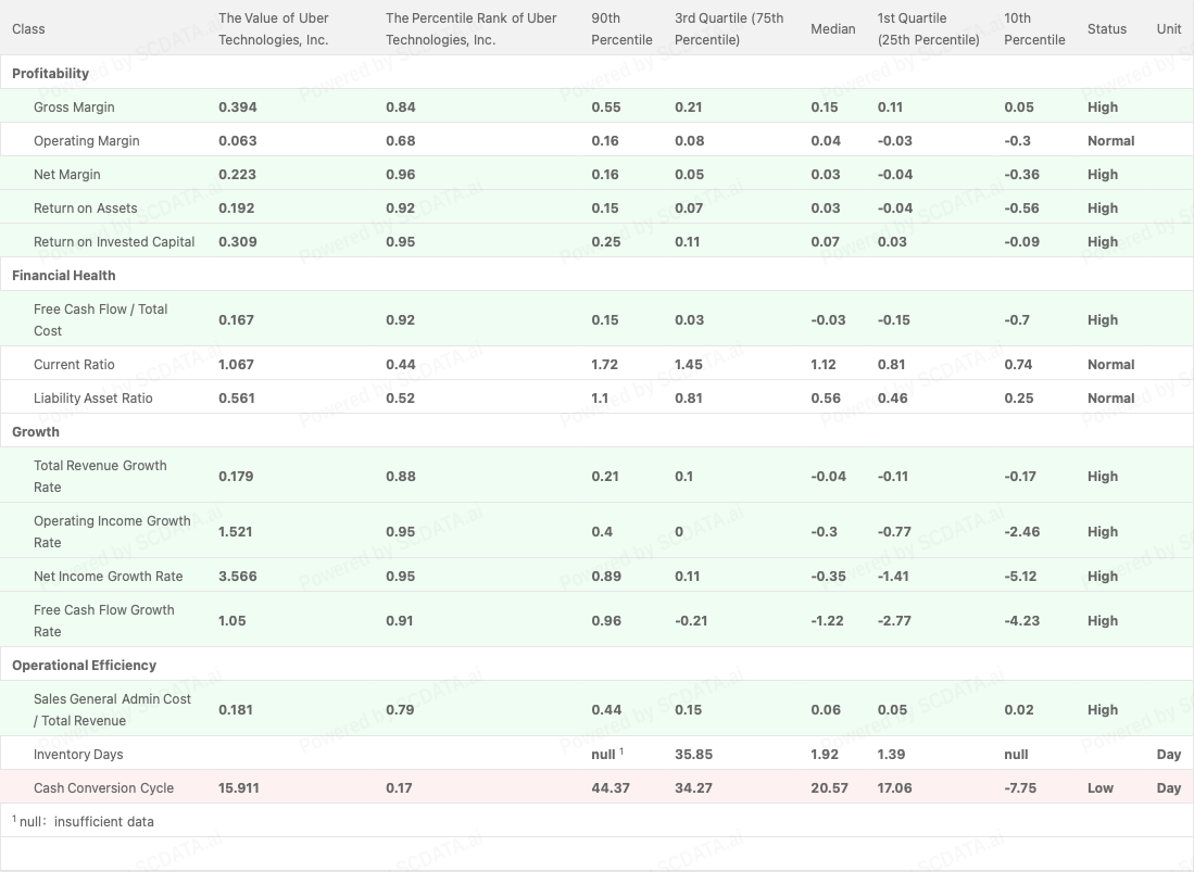 The KPI examination of UBER relative to the U.S. technology/services industry shows a generally strong performance. For profitability, despite a normal operating margin, UBER’s gross margin, net margin, ROA, and ROIC are all higher than the industry, indicating strong overall profitability compared to peers. For financial health, UBER demonstrates solid free cash flow generation, though its current ratio and liability-asset ratio fall within a normal range, suggesting stable but not exceptional short-term liquidity. Regarding growth, while revenue growth is strong, operating income, net income, and free cash flow growth are all significantly higher than the industry, implying robust growth momentum relative to peers. For operational efficiency, UBER maintains a favorable operating cost over revenue ratio, although its cash conversion cycle is relatively high, indicating some inefficiencies in working capital management. Overall, Uber ranks among the stronger performers in its peer group, outperforming many competitors across profitability and growth metrics.