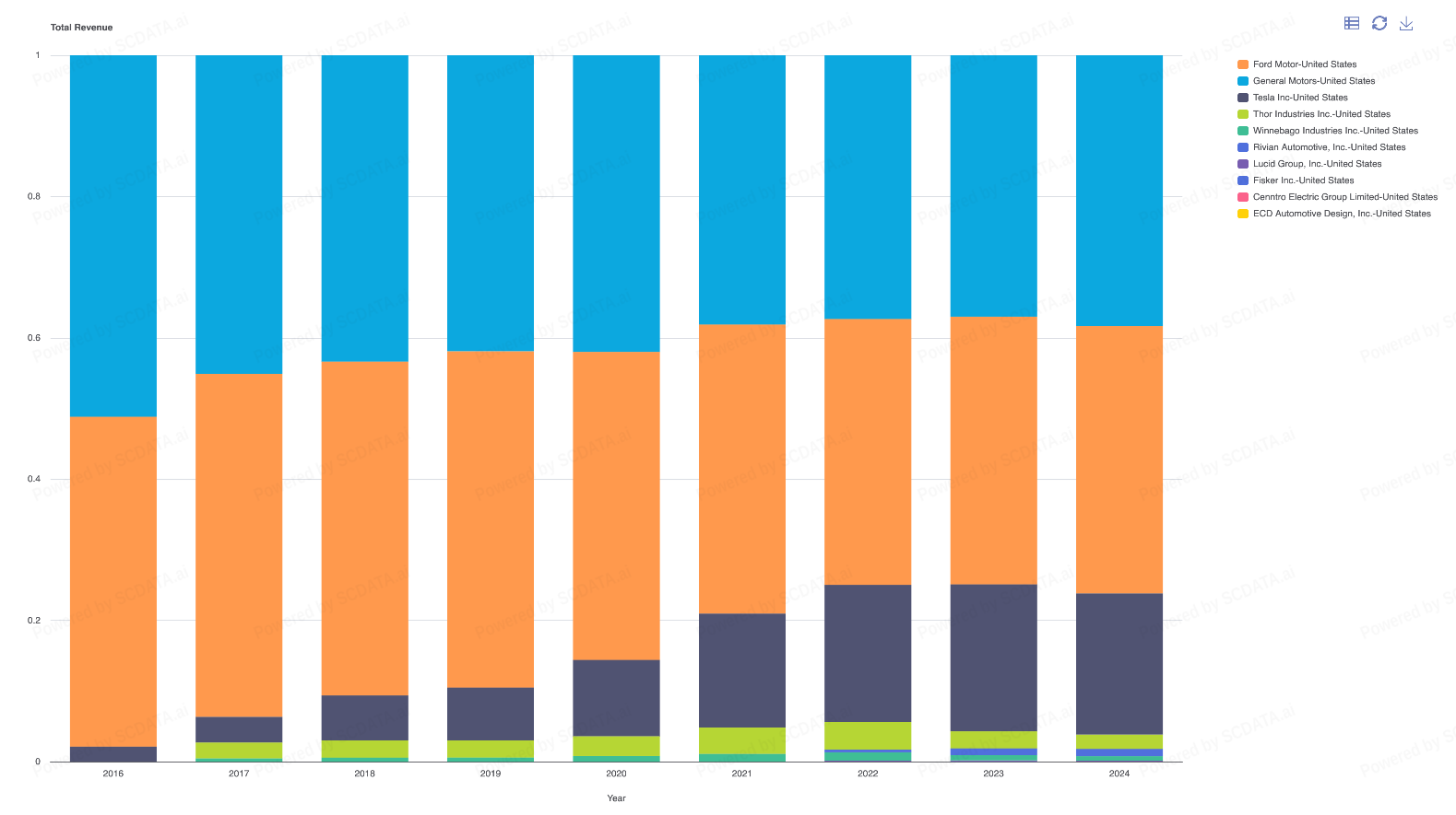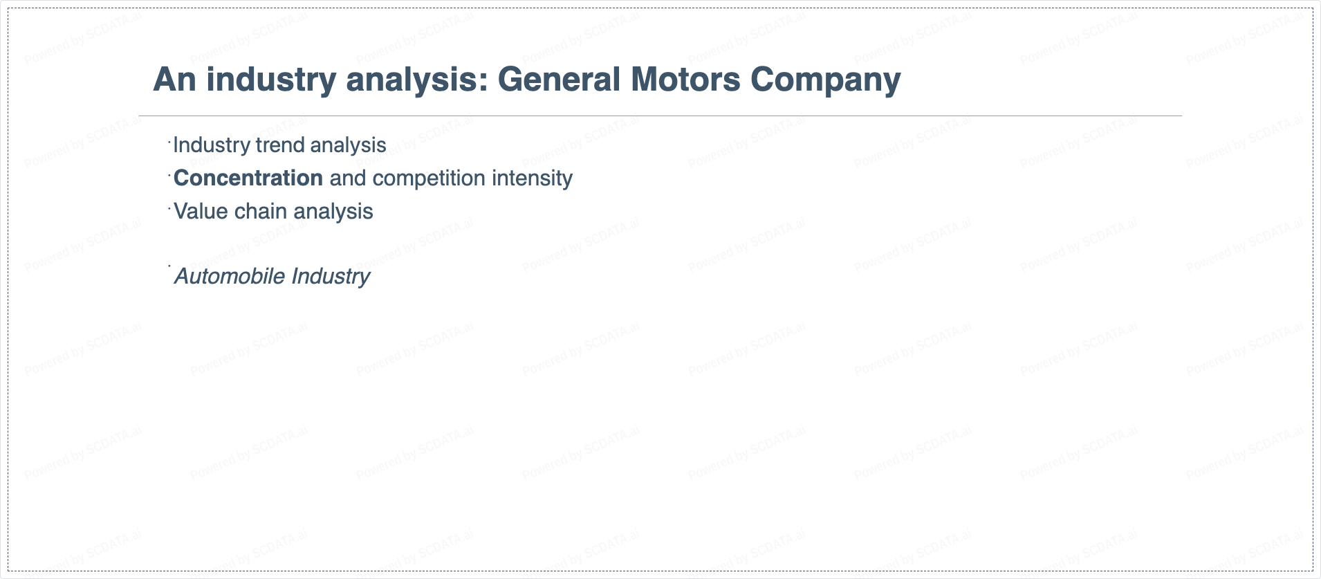 The industry is highly concentrated. There are a few dominant firms including GM, Ford, and Tesla which account for most of the revenue. The four-firm concentration ratio remains near maximum levels, indicating a highly consolidated industry with significant barriers to entry due to capital requirements, manufacturing complexity, and brand dominance.