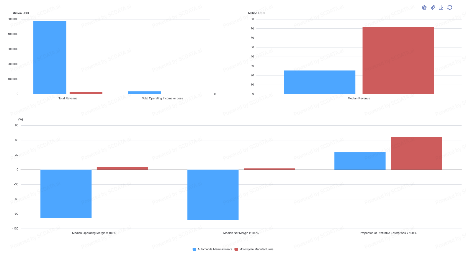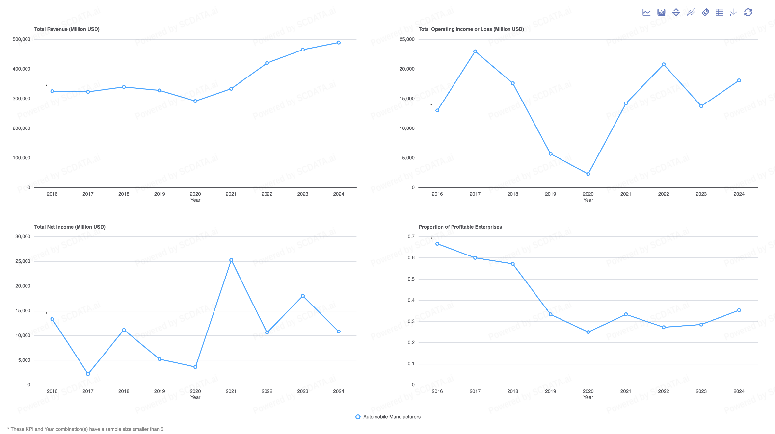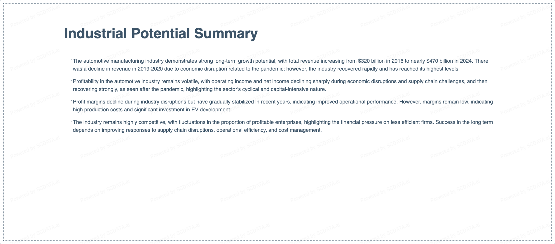 The automotive manufacturing industry shows large scale growth and strong revenue growth potential, but profitability remains highly cyclical due to capital intensity, supply chain disruptions, and other technical transitions.