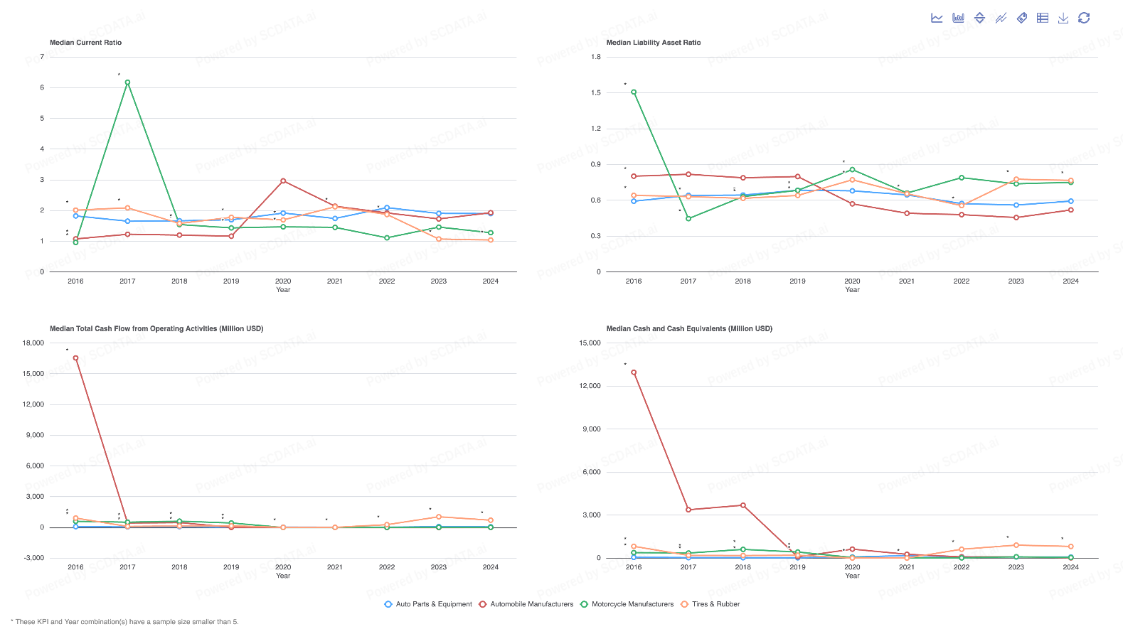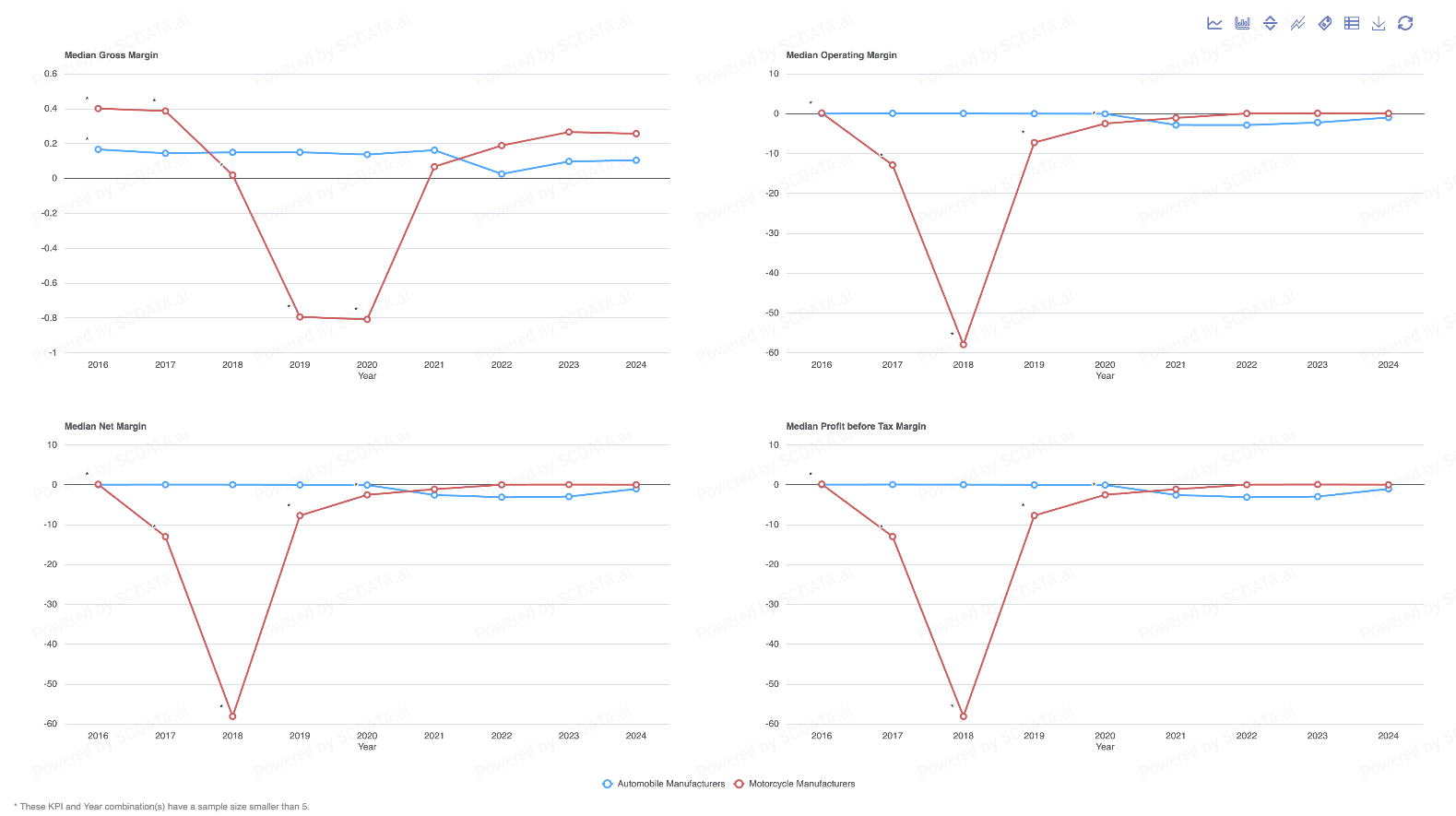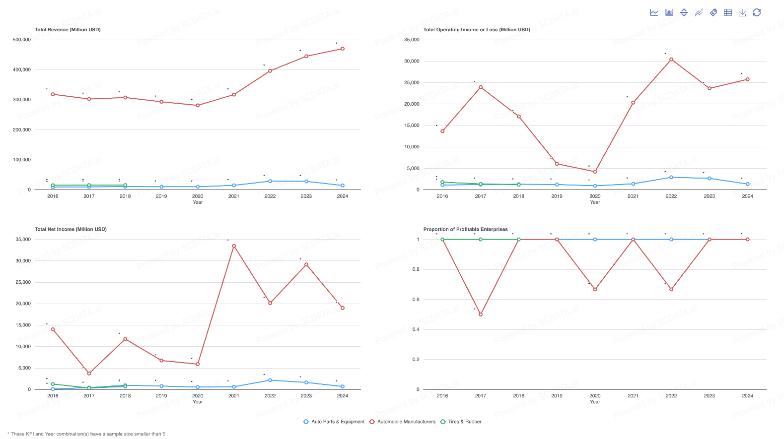 The automotive manufacturing industry shows large scale growth and strong revenue growth potential, but profitability remains highly cyclical due to capital intensity, supply chain disruptions, and other technical transitions.