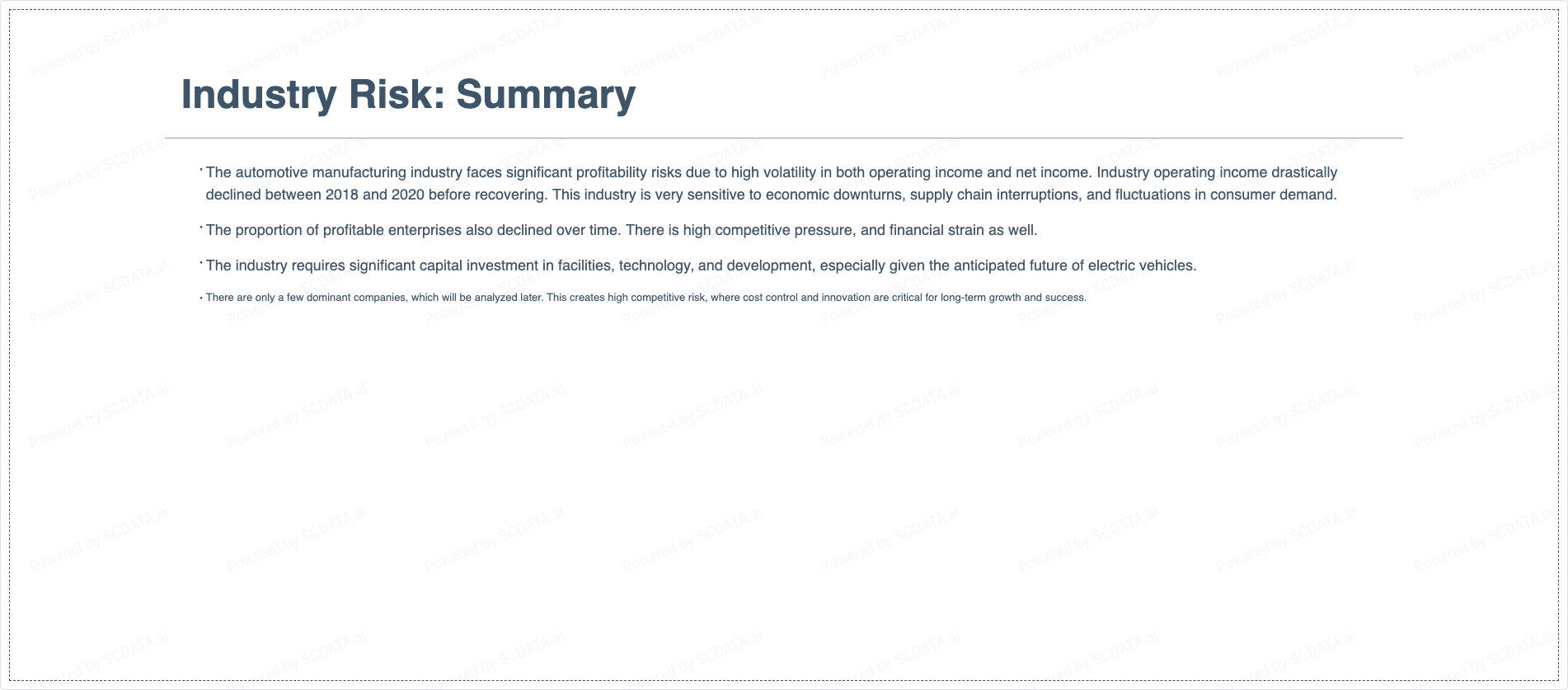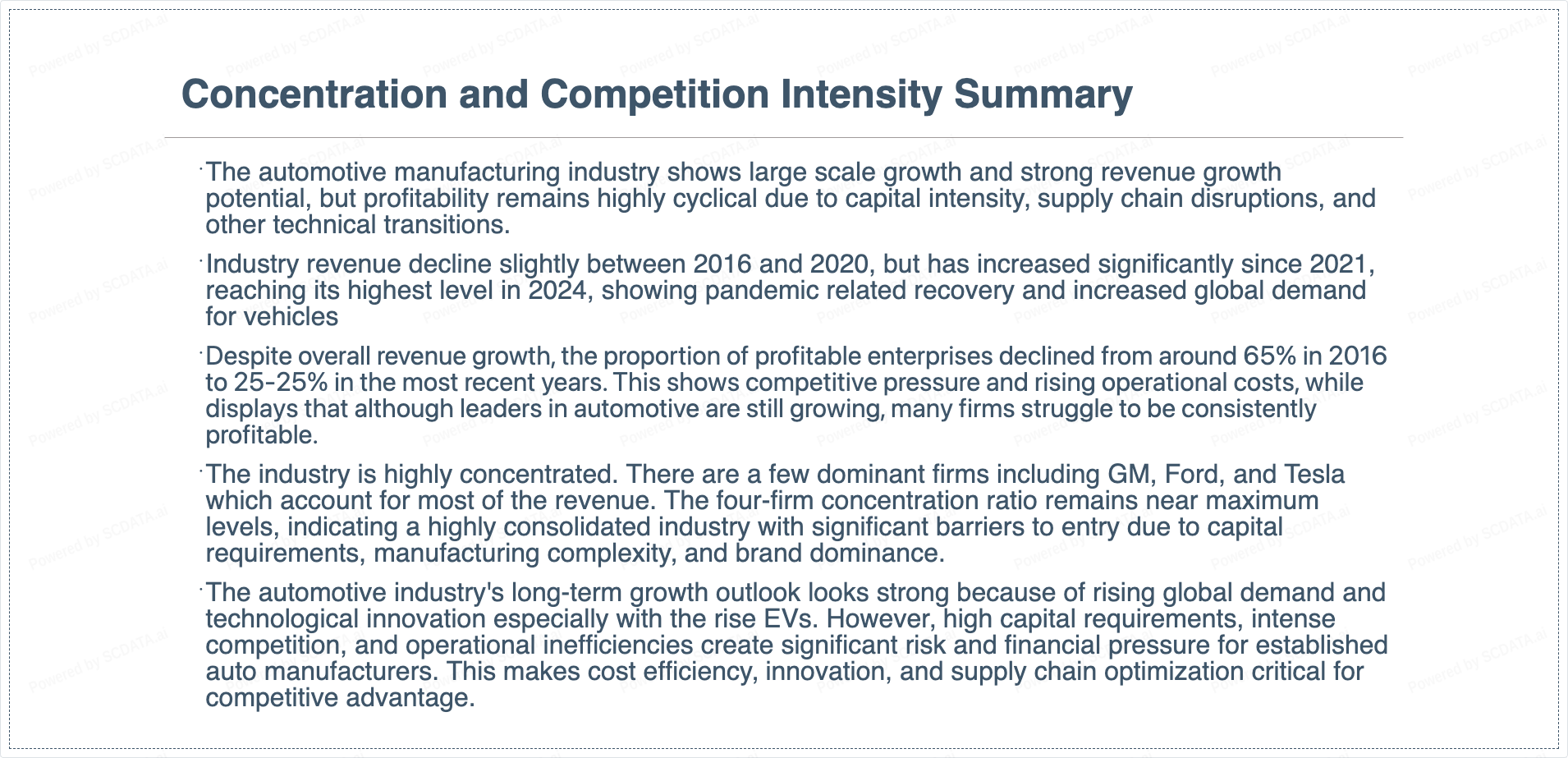 The automotive industry's long-term growth outlook looks strong because of rising global demand and technological innovation especially with the rise EVs. However, high capital requirements, intense competition, and operational inefficiencies create significant risk and financial pressure for established auto manufacturers. This makes cost efficiency, innovation, and supply chain optimization critical for competitive advantage.
