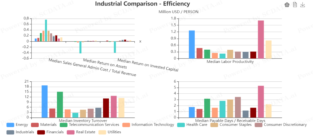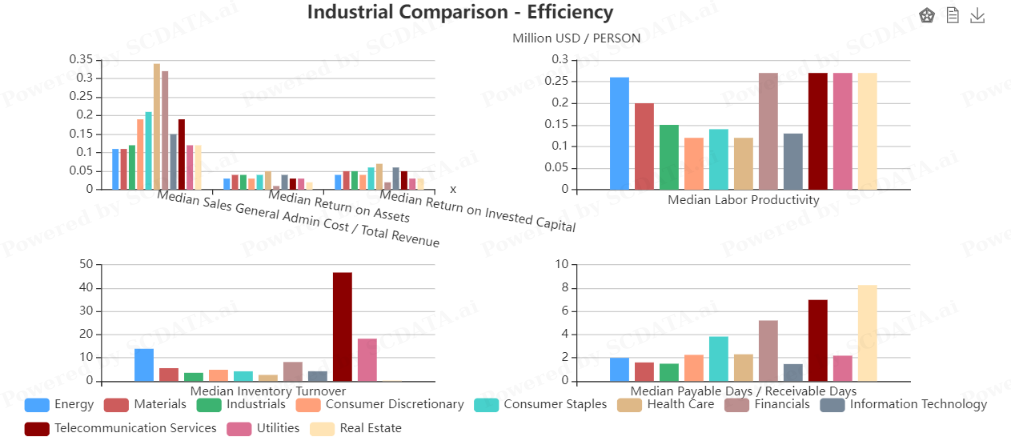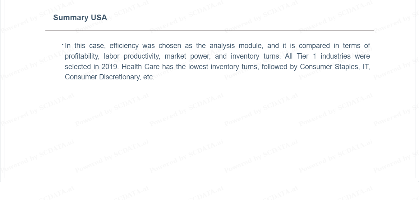 In this case, efficiency was chosen as the analysis module, and it is compared in terms of profitability, labor productivity, market power, and inventory turns. All Tier 1 industries were selected in 2019. Health Care has the lowest inventory turns, followed by Consumer Staples, IT, Consumer Discretionary, etc.