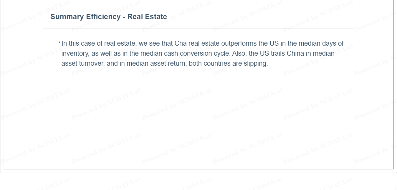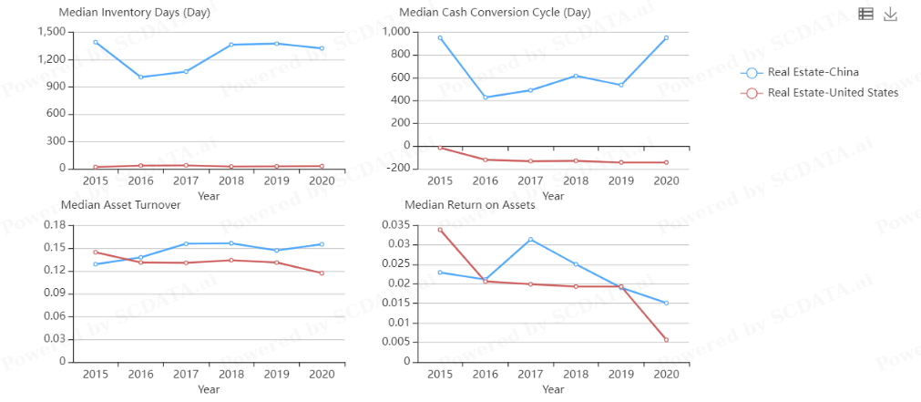 In this case of real estate, we see that Cha real estate outperforms the US in the median days of inventory, as well as in the median cash conversion cycle. Also, the US trails China in median asset turnover, and in median asset return, both countries are slipping.