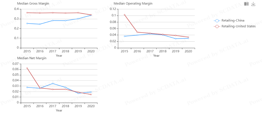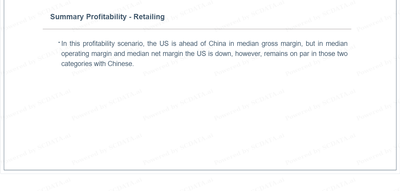 In this profitability scenario, the US is ahead of China in median gross margin, but in median operating margin and median net margin the US is down, however, remains on par in those two categories with Chinese.