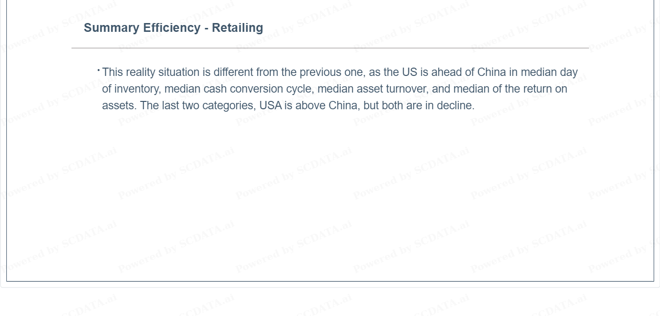 This reality situation is different from the previous one, as the US is ahead of China in median day of inventory, median cash conversion cycle, median asset turnover, and median of the return on assets. The last two categories, USA is above China, but both are in decline.