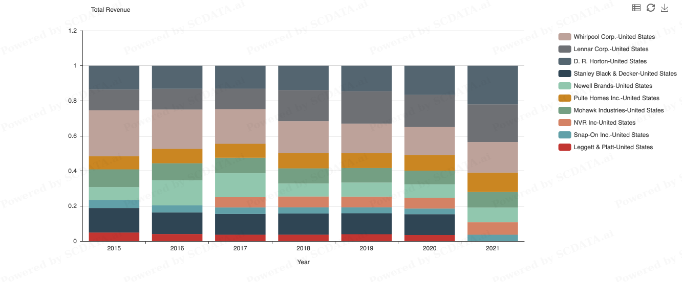 The top four firms in household durables keep expanding in the five years. Almost account for 80% of revenue in 2021.