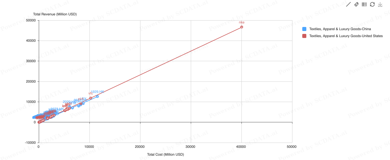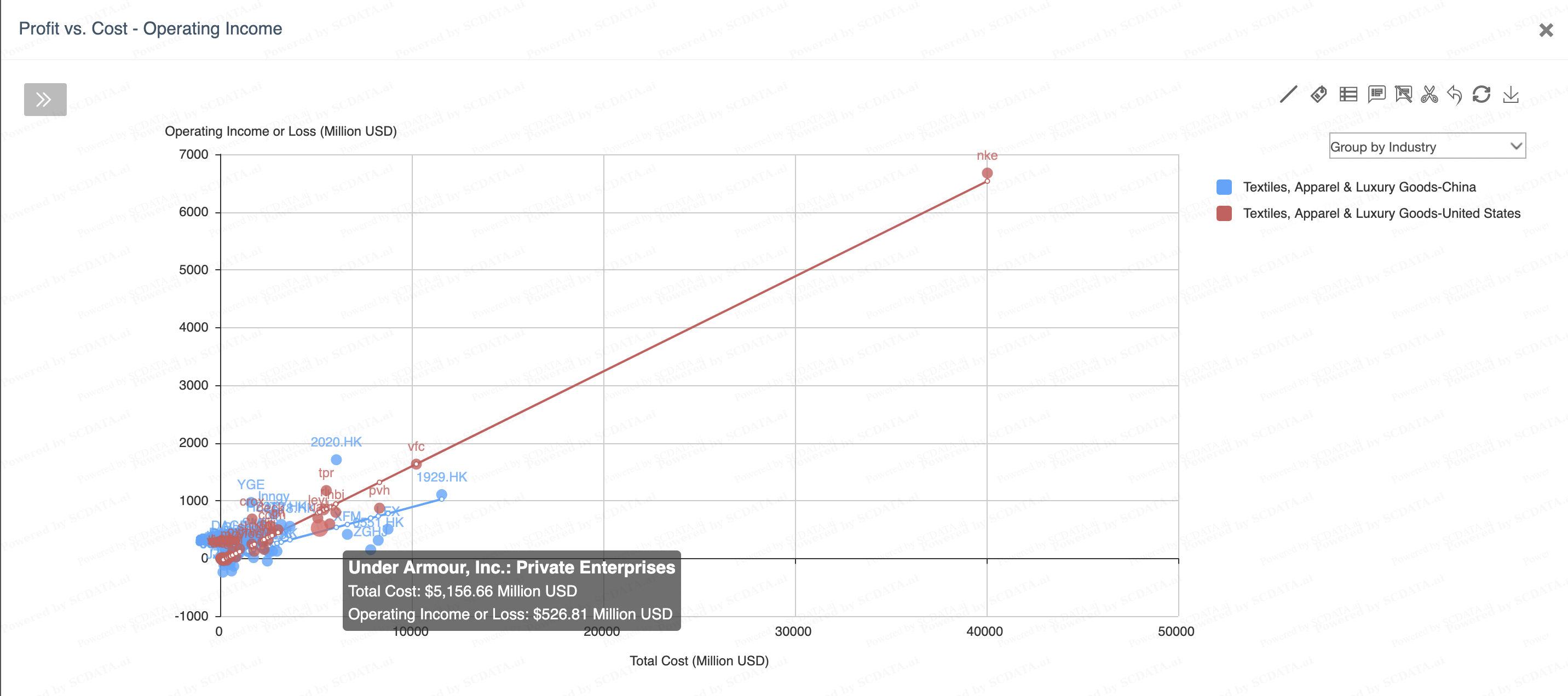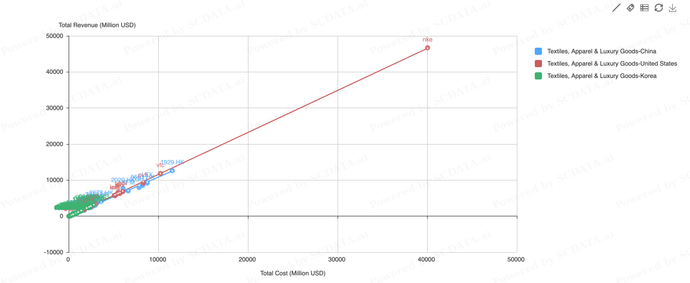In the revenue vs. cost, besides choosing the US, I also chose Korean and China's companies in comparison. I chose Korea & China because both countries have high net margins on a global scale. However, the graph shows that Korea has a relatively small market. I decided to preclude it in the following analysis. And, of course, it is not a surprise that Nike has the largest revenue and costs.