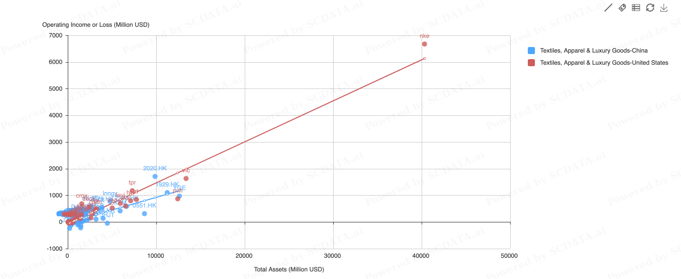 We could see how efficiently these companies utilize their assets to make money through the operating income vs. total assets analysis. Nike outperformed all other companies with lower assets to generate more money, so as Crocs. However, we could find that under armour is still under the regression line.