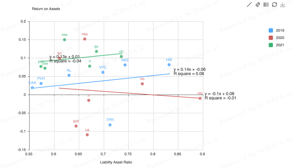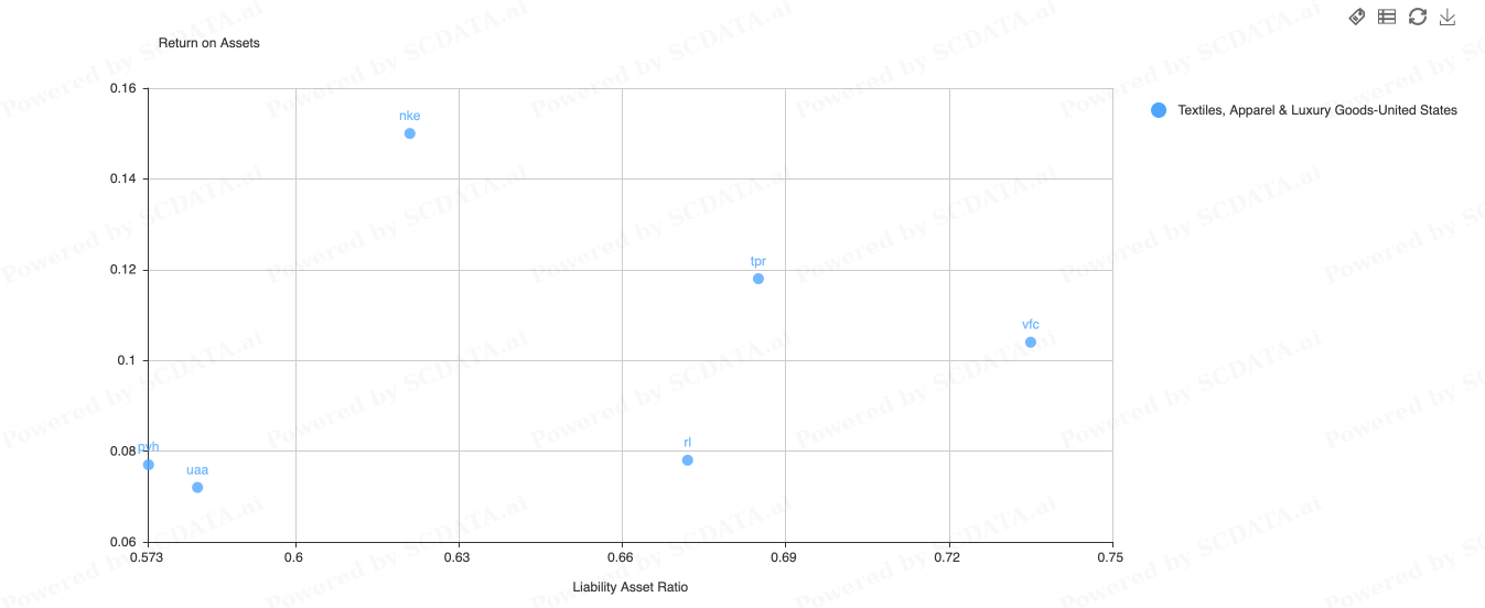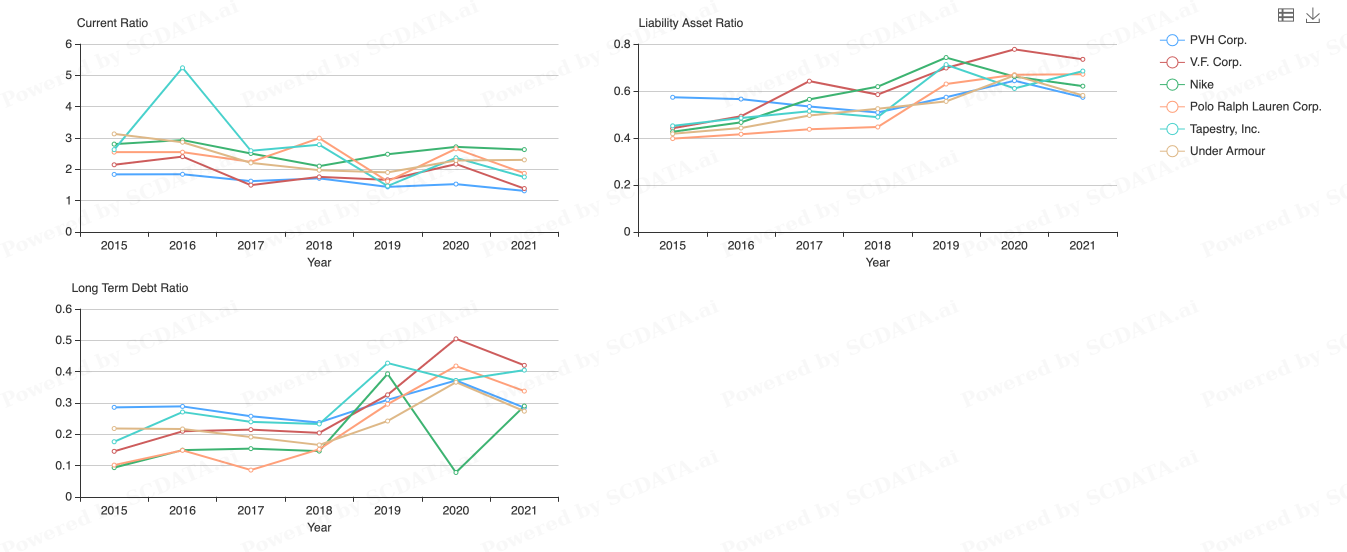 In the risk vs. return analysis, uaa performed not badly compared with others. Furthermore, pvh has the lowest liability asset ratio.
