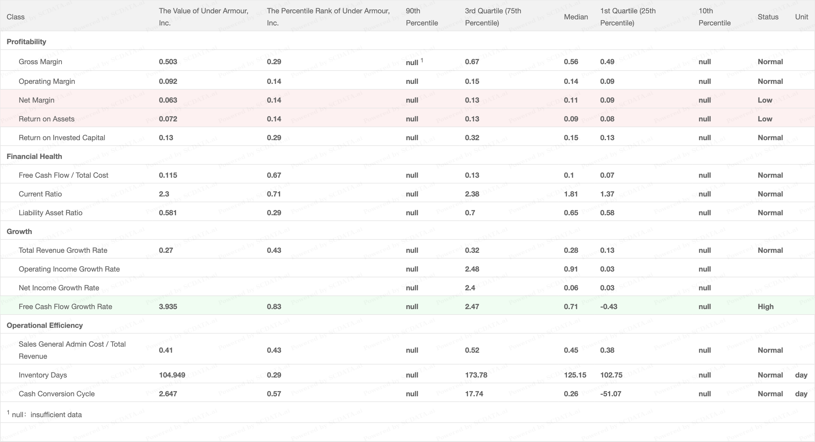 Here's the KPI examination of Under Armour, and the population is the SP500 companies in the textiles industry. Based on previous analysis, UA has a low Net Margin and ROA performance. However, UA has a high Free Cash Flow Growth rate indicating that UA is generating increasing amounts of cash that can be used for various purposes, such as reinvesting in the business, paying off debt, or returning value to shareholders. Other indicators show an average compared with the population.