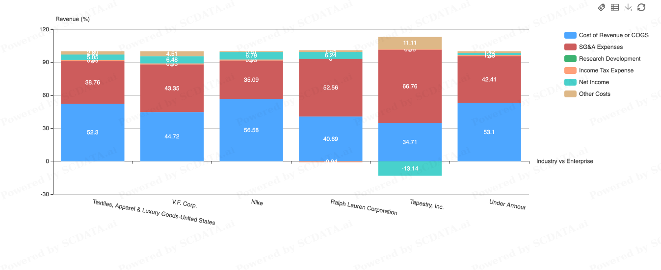 In the revenue breakdown, UA has lower COGS compared to Nike but its SG&A was higher than Nike before the pandemic. Saying that both figures of UA were higher than the industry's average.