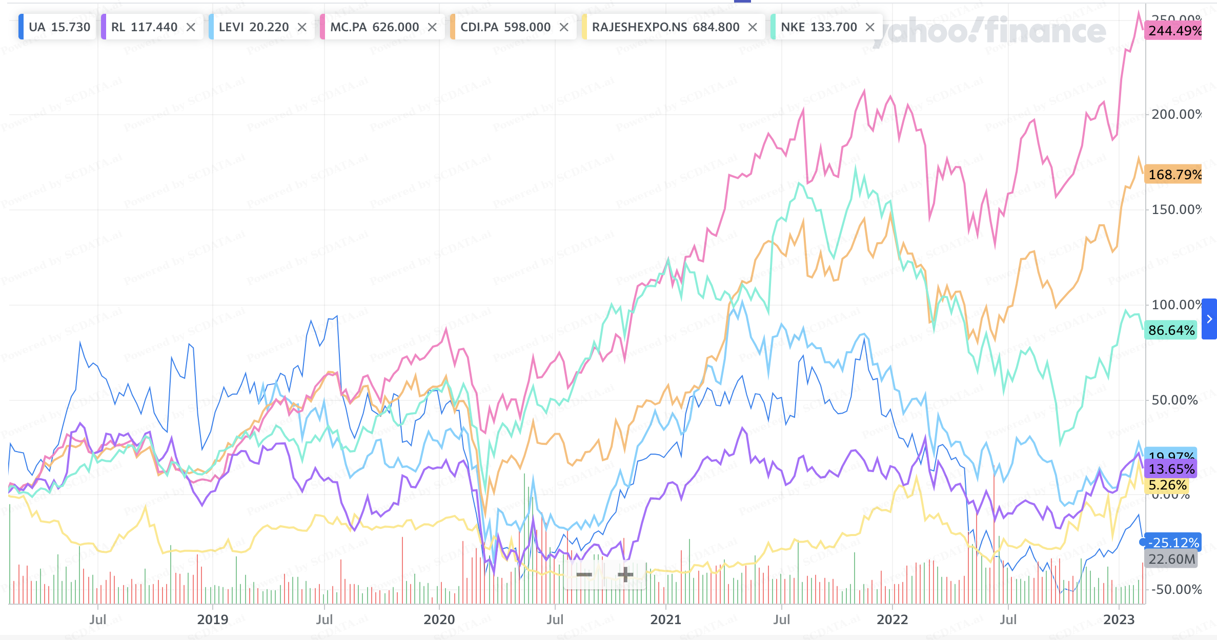 In the five years stock market within the same industry, including the top 3 enterprises and UA, RL, LEVI, NIKE